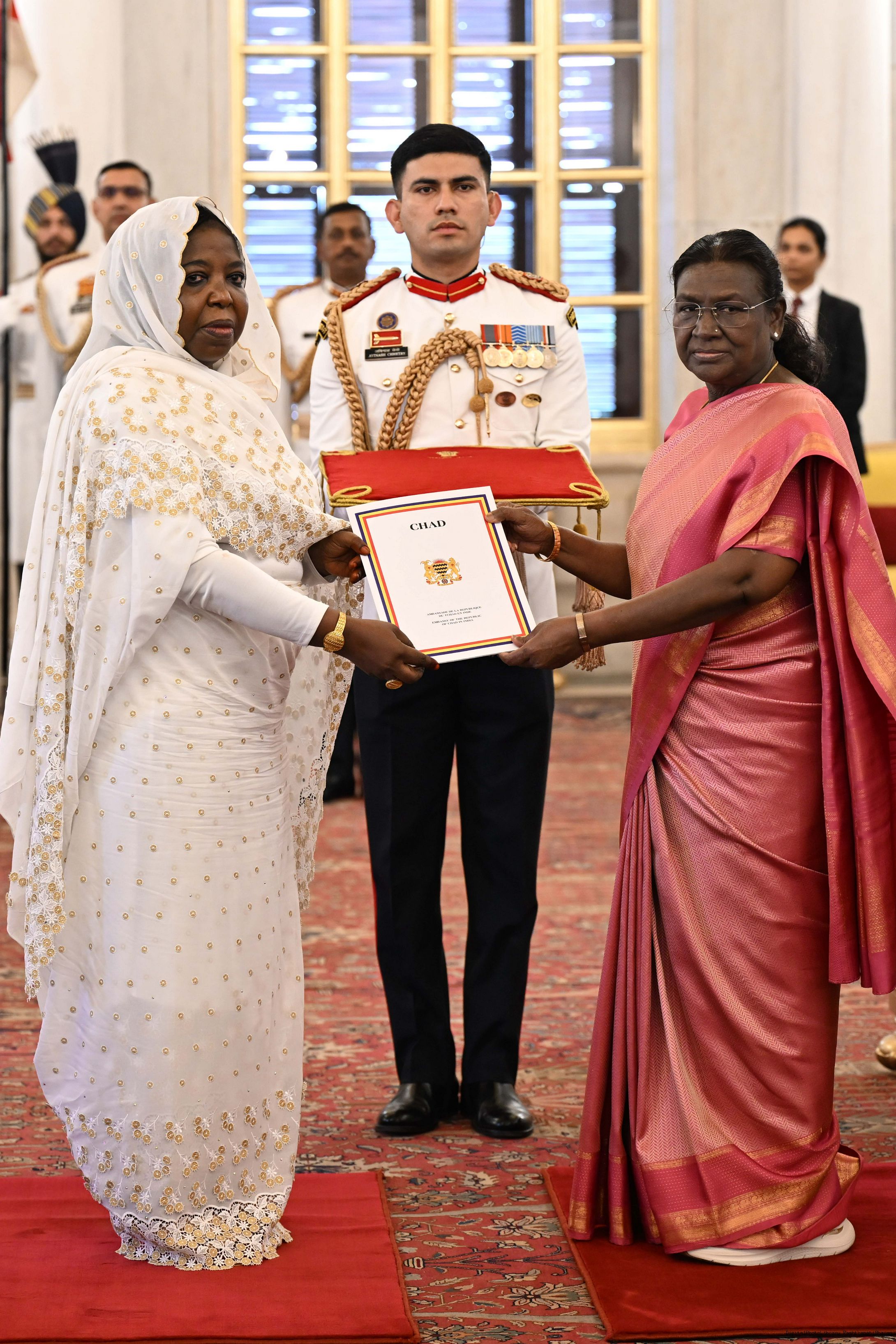 H.E. Mrs Ildjima Badda Mallot, Ambassador of the Republic of Chad presenting credentials to the President of India, Smt Droupadi Murmu at a ceremony held at Rashtrapati Bhavan on May 30, 2025.