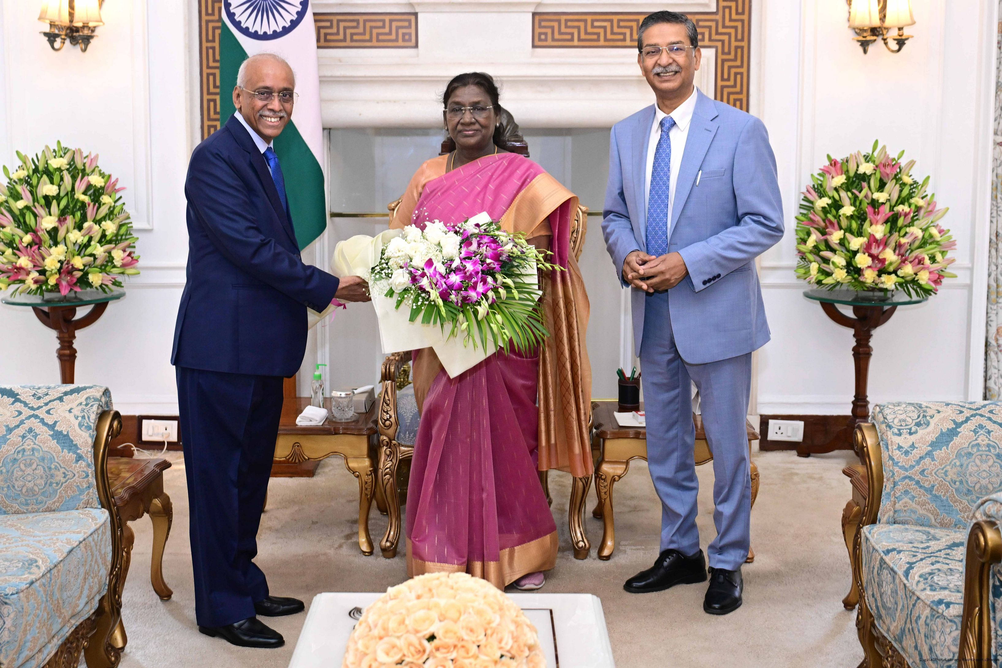 Justice Shri V. Ramasubramanian, Chairperson, NHRC and Shri Bharat Lal, Secretary General, NHRC meeting with the President of India, Smt. Droupadi Murmu at Rashtrapati Bhavan on November 6, 2025.
