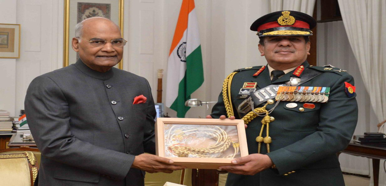 Lt. Gen. Sarath Chand, Vice Chief of Army Staff & Hony ADC to the President along with his Spouse Smt. Bindu Sarath Chand meeting with the President of India, Shri Ram Nath Kovind, at Rashtrapati Bhavan on May 28, 2018.