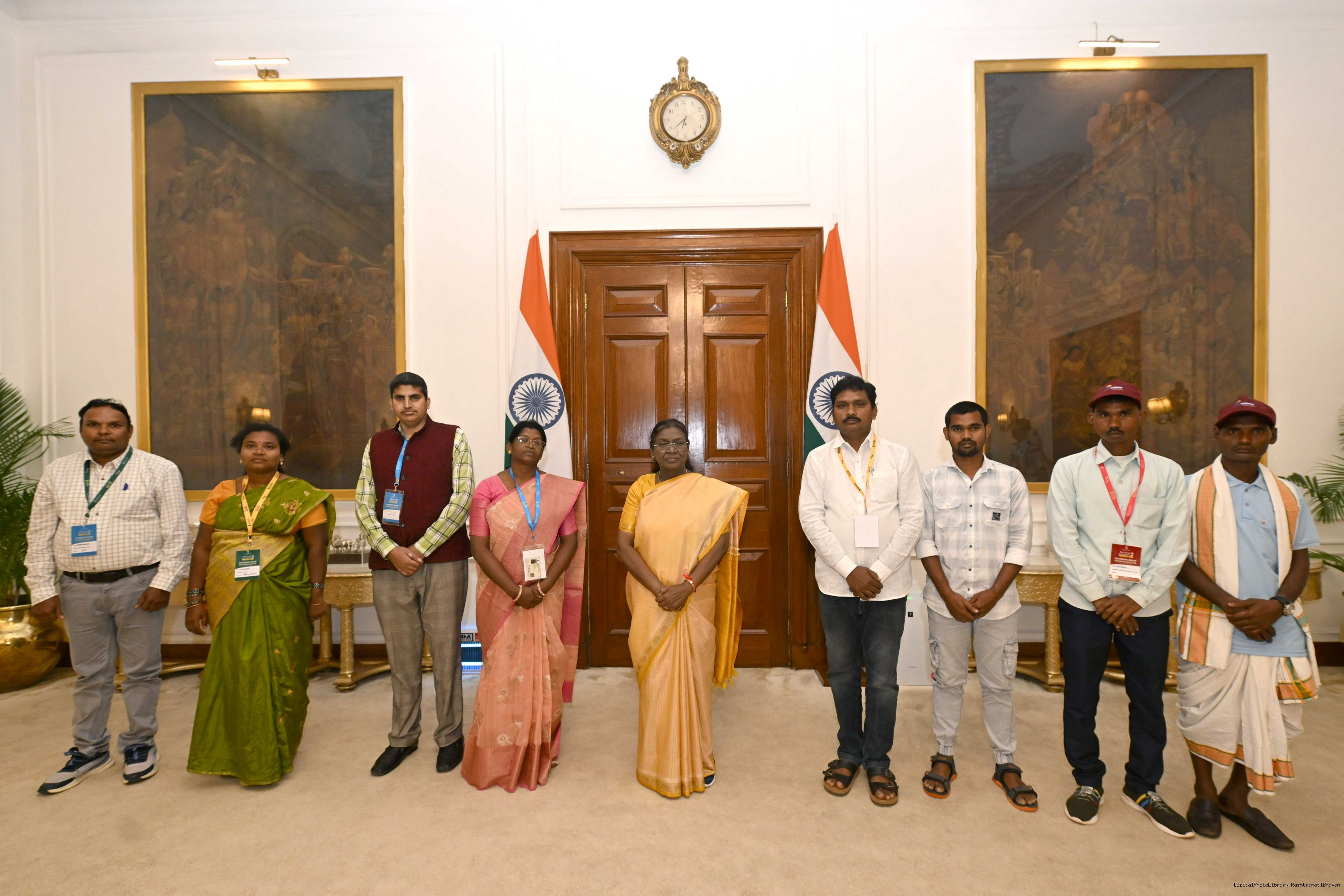 Ms. Kabita Singh along with others (Aadi SaathisAadi Sahayogis) meeting with the President of India, Smt. Droupadi Murmu at Rashtrapati Bhavan on October 17, 2025.