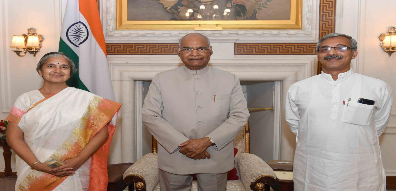 Ms. Nivedita R Bhide, Vice President, Vivekananda Kendra, Kanyakumari along with Shri Manas Bhattacharjee, Pranta Samghatak, New Delhi meeting with the President of India, Shri Ram Nath Kovind, at Rashtrapati Bhavan on April 26, 2019.