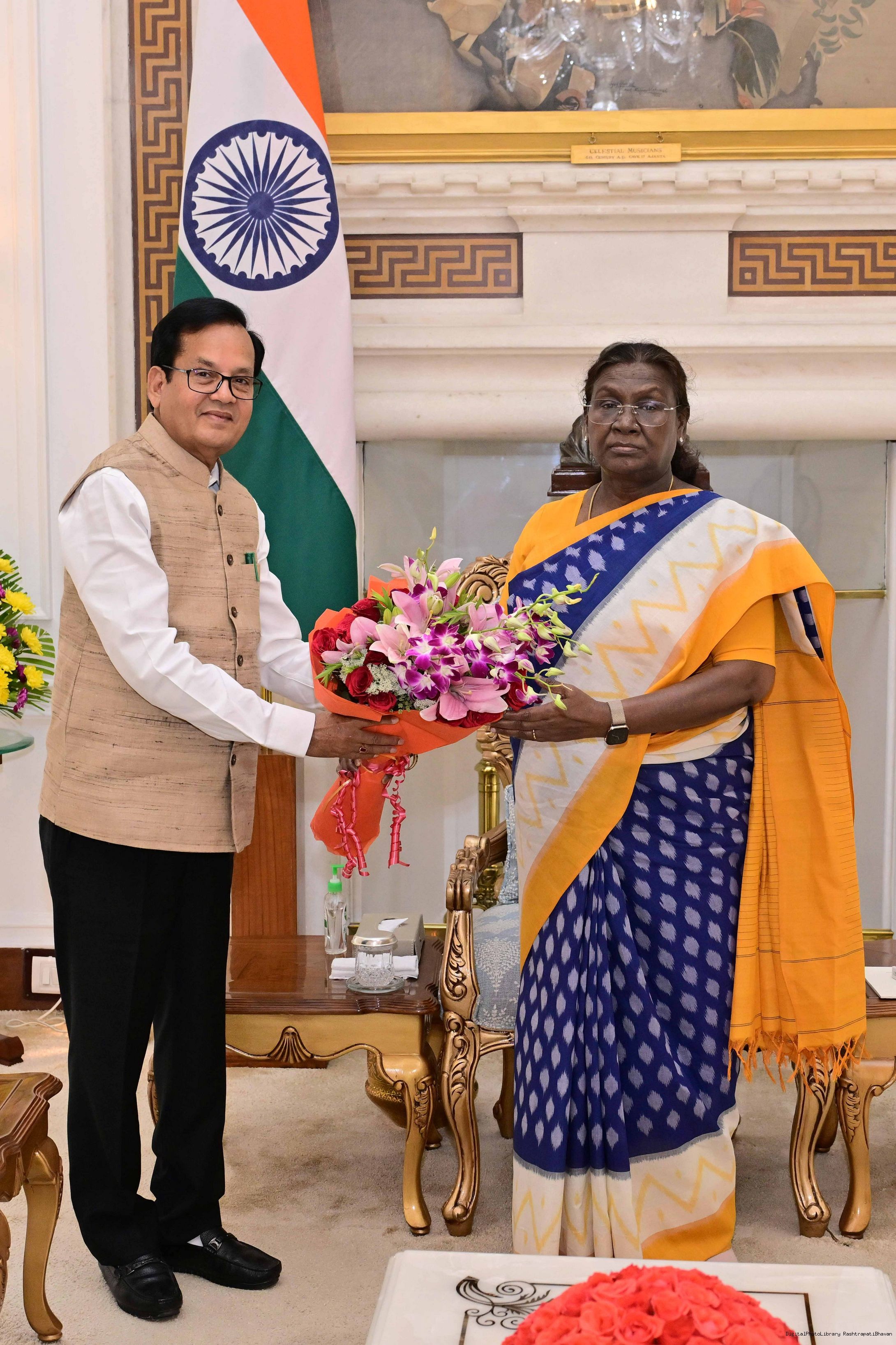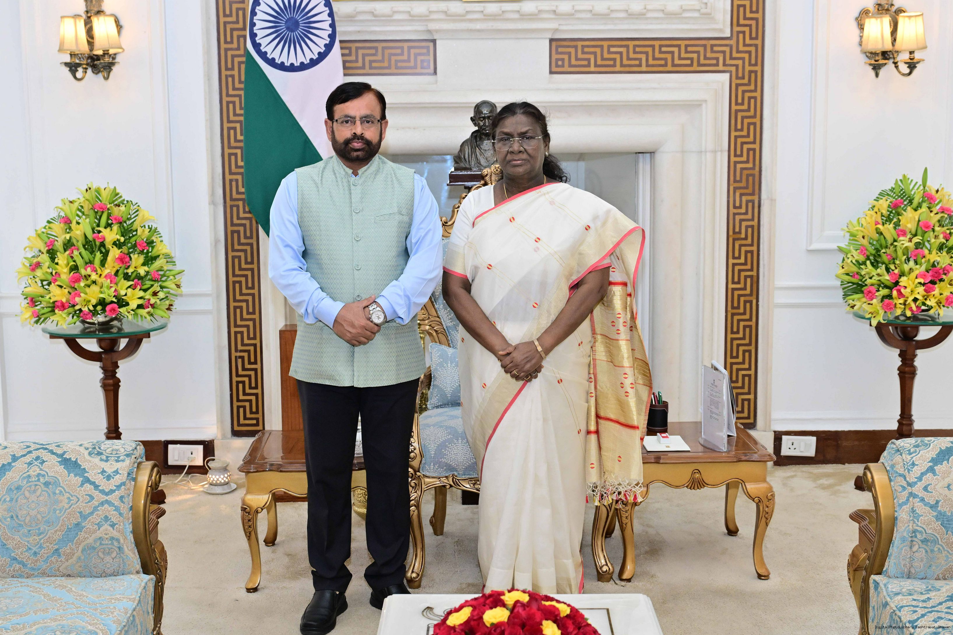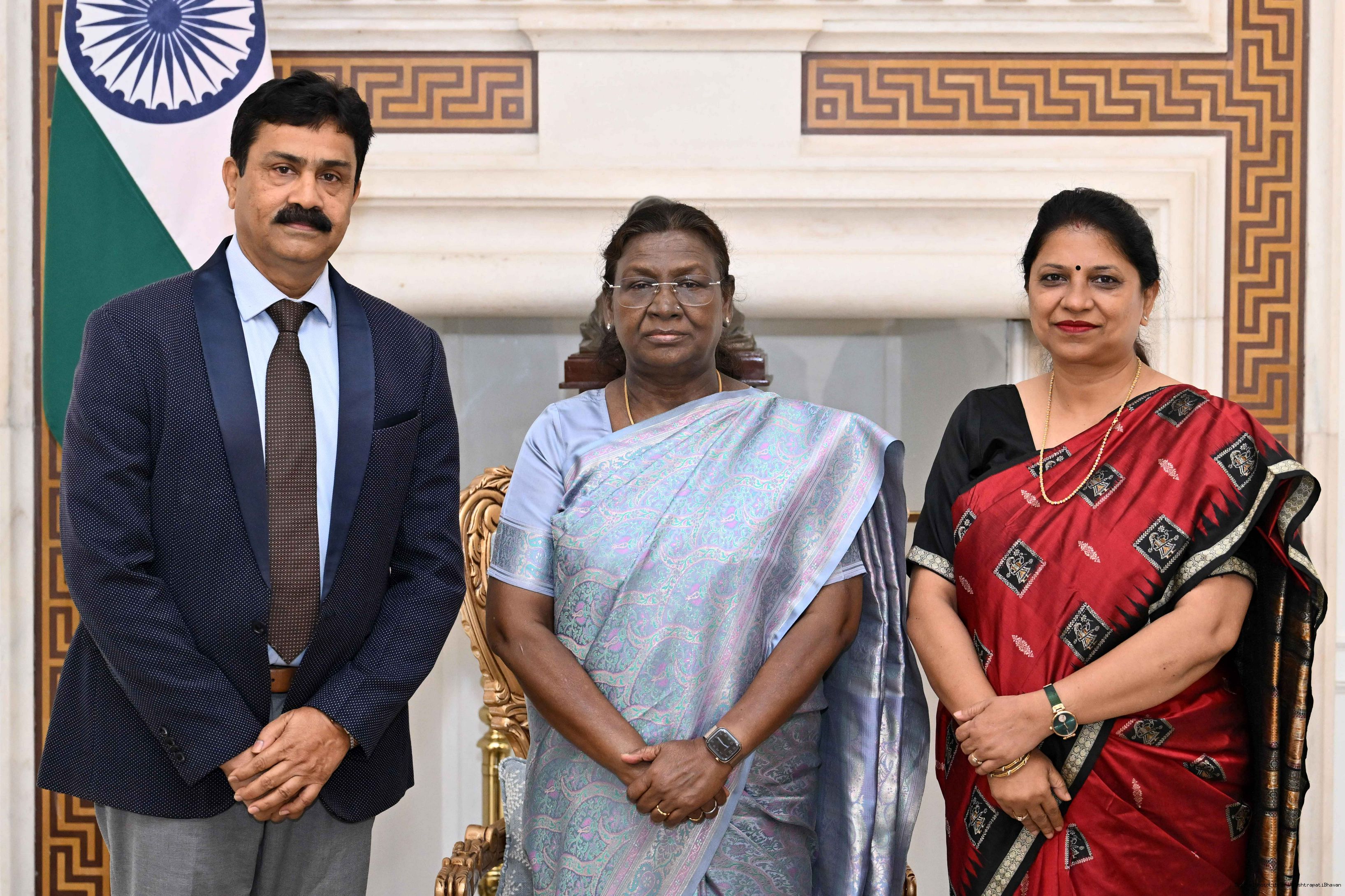 Prof. Kishor K. Basa, Chairman, National Monuments Authority, Ministry of Culture, Govt of India along with brother Shri Ashok Basa meeting with the President of India, Smt. Droupadi Murmu at Rashtrapati Bhavan on November 18, 2025.
