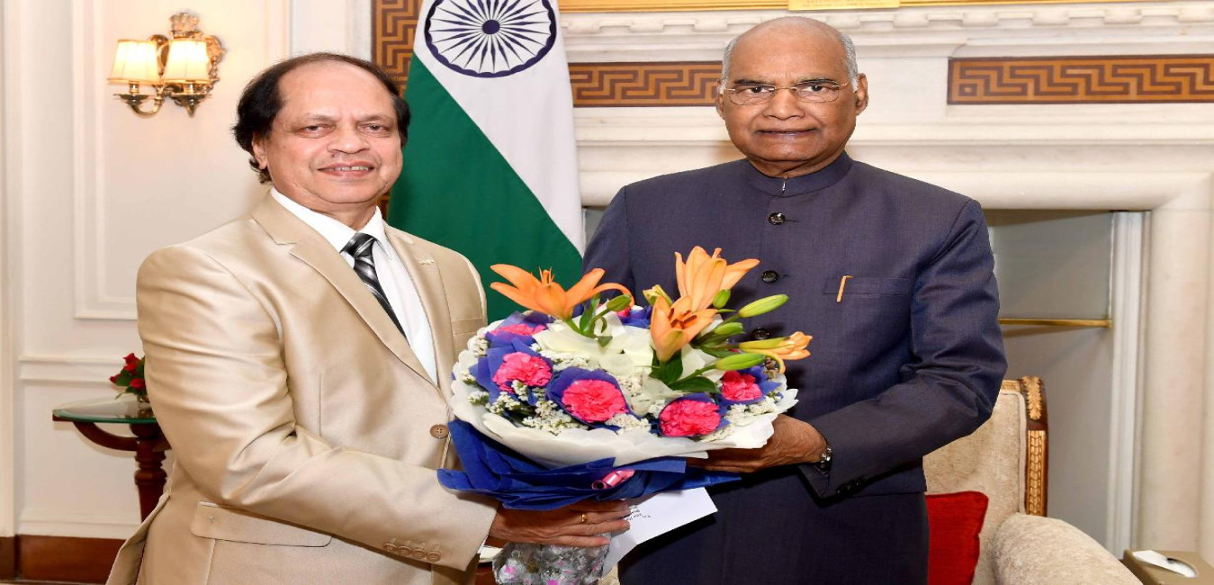 Prof. Sachidananda Mohanty, Member, Governing Board, Auroville Foundation, Ministry of HRD meeting with the President of India, Shri Ram Nath Kovind, at Rashtrapati Bhavan on February 15, 2020.