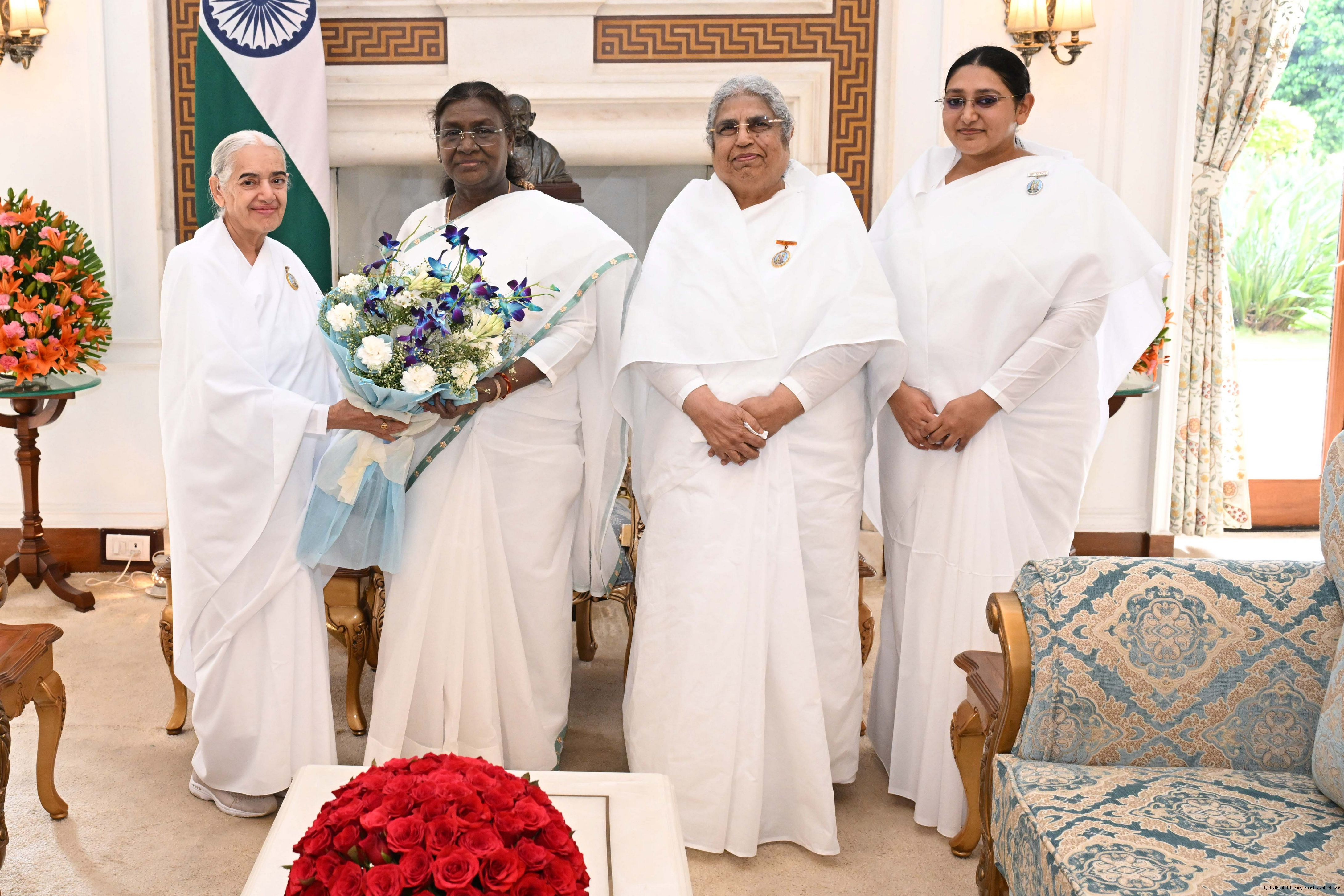 Rajyogini BK Jayanti, Additional Chief of Brahma Kumaris along with Rajyogini BK Asha and Nikita meeting with the President of India, Smt Droupadi Murmu at Rashtrapati Bhavan on July 7, 2025.