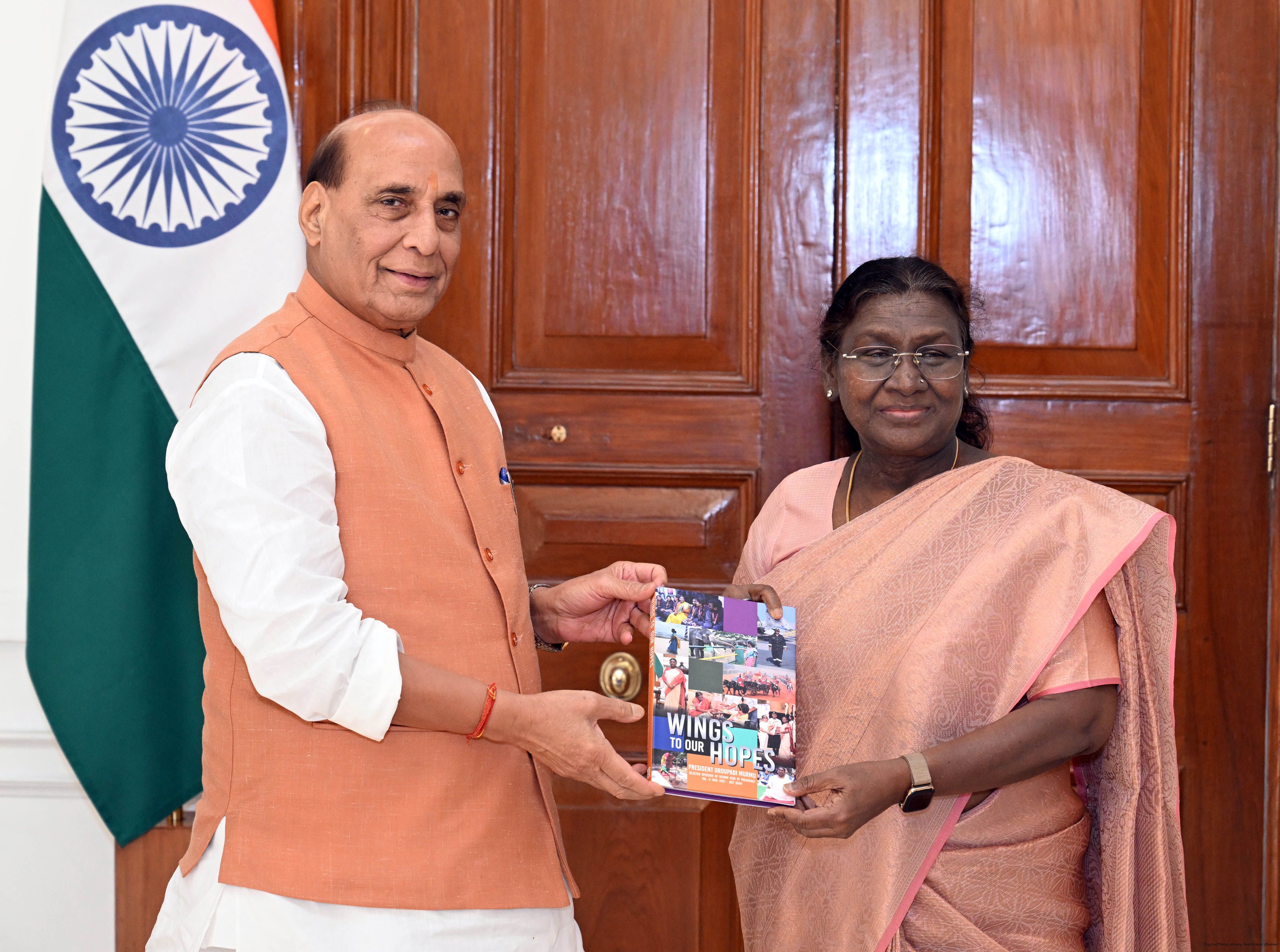 Raksha Mantri, Shri Rajnath Singh, along with Minister of Information Broadcasting, Shri Ashwini Vaishnaw and Minister of State for Information Broadcasting, Dr L. Murugan, presented first copies of the second volume of the books ‘Wings to Our Hopes’ and ‘Aashaon Ki Udaan’ to the President of India, Smt. Droupadi Murmu at Rashtrapati Bhavan on June 23, 2025.