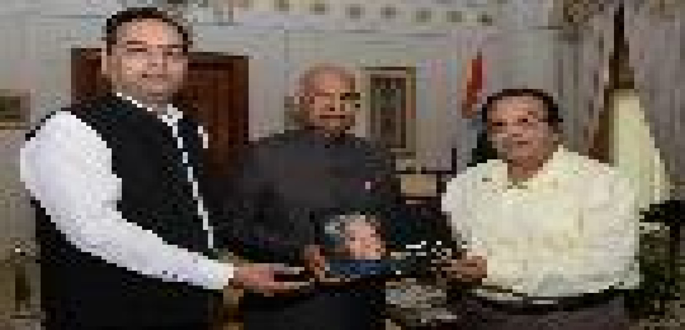 Shri Milan Prabhat from Lucknow and Shri Harsh Vardhan, Writer & Editor presenting a Coffee Table Book 'Geeton ke Darvesh: Gopal Das Neeraj' to the President of India, Shri Ram Nath Kovind, at Rashtrapati Bhavan on October 26, 2018.