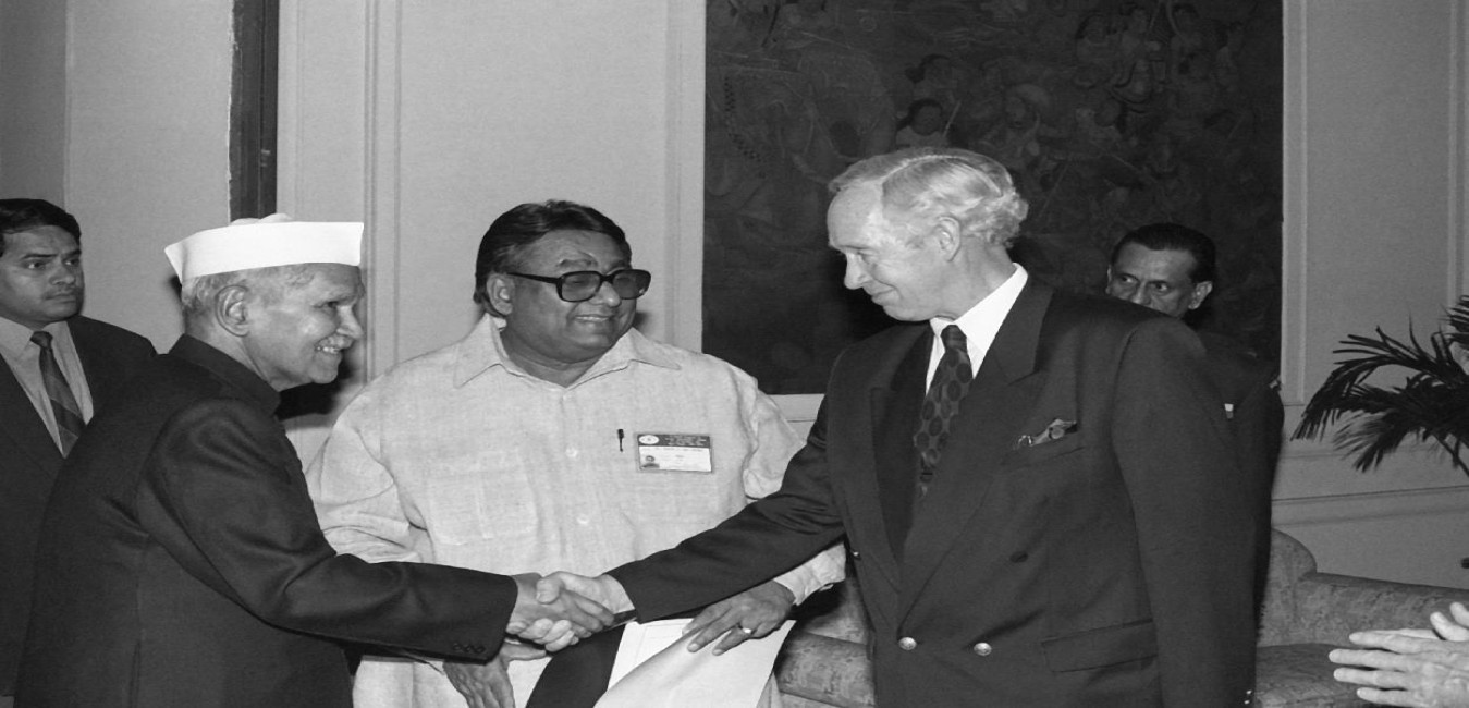 The President of India, Dr. Shankar Dayal Sharma receiving Greetings from the Prime Minister, Shri P.V. Narasimha Rao, Council of Ministers, Members of Parliament, Rashtrapati Bhavan staff and members of public, at Rashtrapati Bhavan in New Delhi on January 01, 1995.