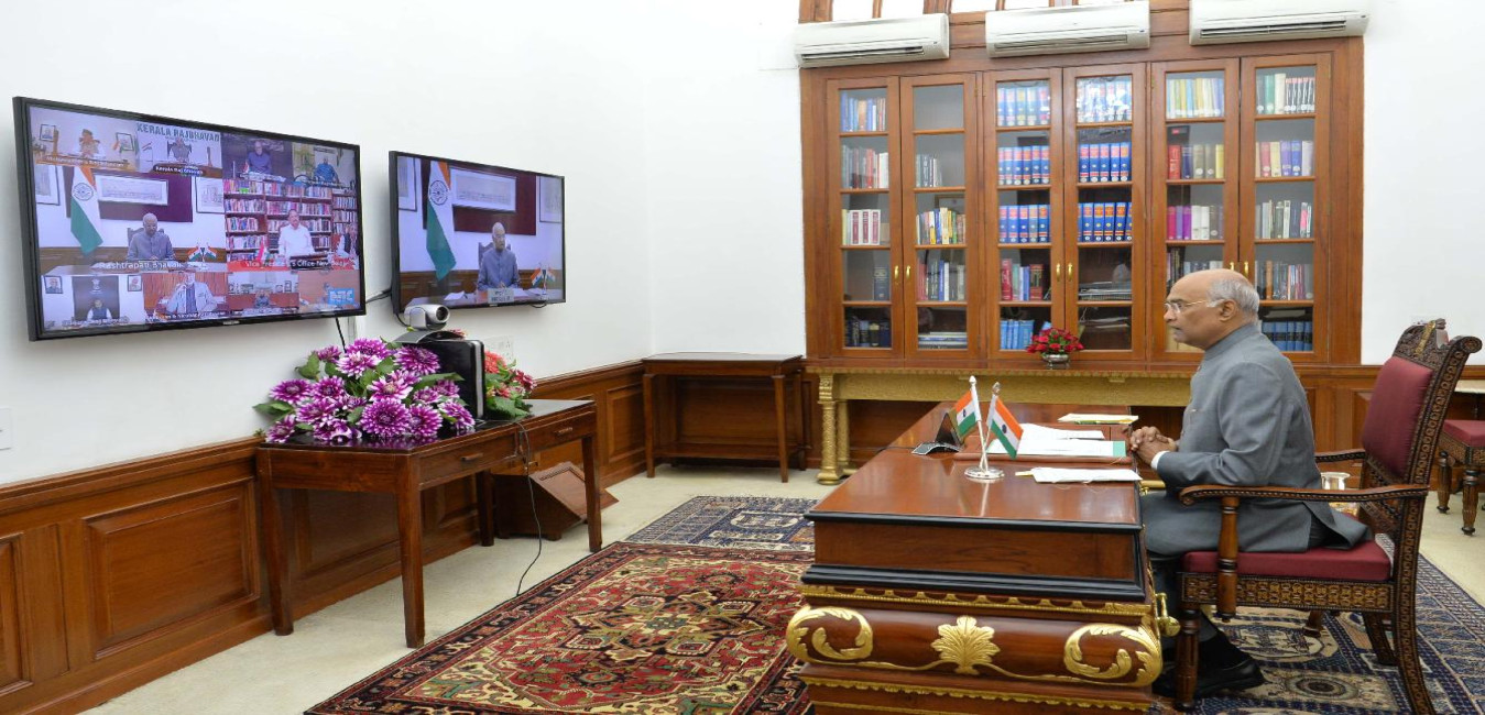 The President of India, Shri Ram Nath Kovind along with the Vice President of India, interacts with the Governors, Lt Governors and Administrators of all the States and Union Territories on issues related to COVID-19 through video conferencing, at Rashtrapati Bhavan on March 27, 2020.