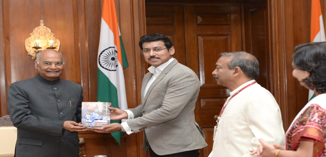 The Minister of State (I/C) for Information & Broadcasting, Col. Rajyavardhan Singh Rathore along with the Secretary, Ministry of Information and Broadcasting, Shri Amit Khare and officials from Publications Division meeting with the President of India, Shri Ram Nath Kovind, at Rashtrapati Bhavan on December 08, 2018.