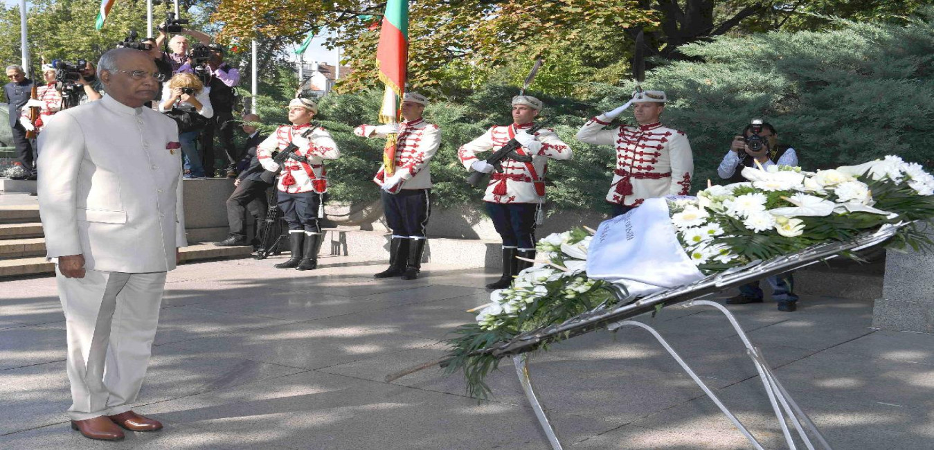 The President of India, Shri Ram Nath Kovind laying wreath at the Unknown Soldier's Monument, at Saint Alexander Nevski Square, in Sofia, Bulgaria on September 05, 2018.