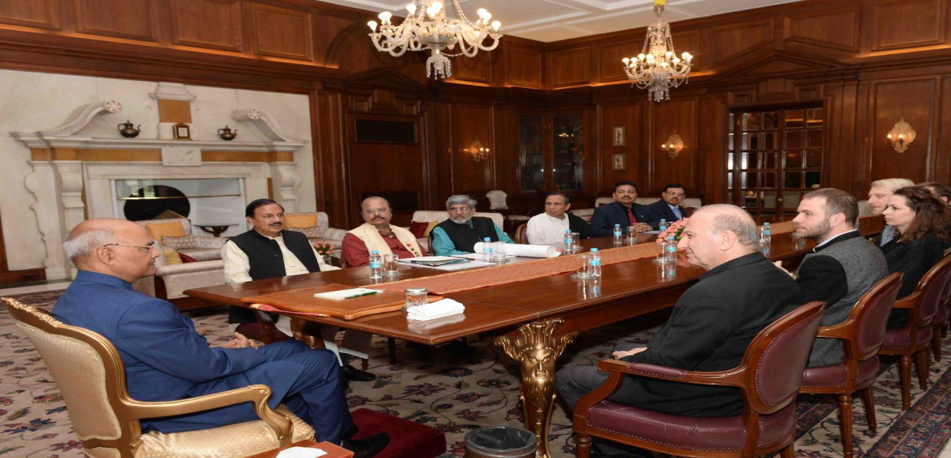 The Minister of State (IC) for Culture and Minister of State for Environment, Forest & Climate Change, Dr. Mahesh Sharma alongwith organizers of the 8th Theatre Olympics meeting with the President of India, Shri Ram Nath Kovind, at Rashtrapati Bhavan on February 19, 2018.