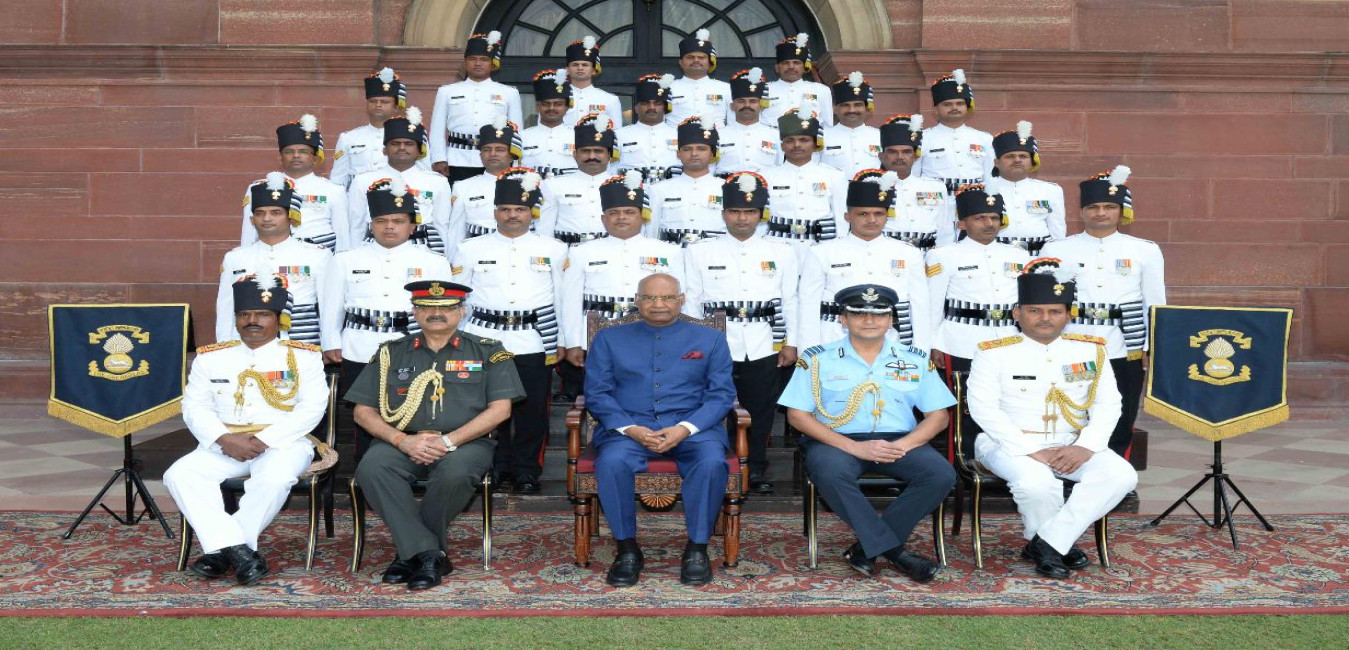 The President of India, Shri Ram Nath Kovind in a group photograph with the Grenadiers Military Band in attachment with Rashtrapati Bhavan, at Rashtrapati Bhavan on September 28, 2017.