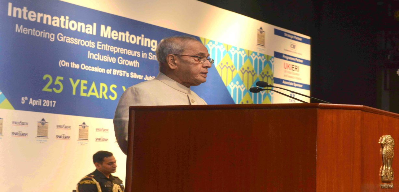 The President of India, Shri Pranab Mukherjee presenting the Bharatiya Yuva Shakti Trust Young Grassroots Entrepreneur Awards in various categories, at the Special Plenary Session of Summit on "Mentoring Grassroots Entrepreneurs in Smart Grams for Inclusive Growth", at Rashtrapati Bhavan Auditorium on April 05, 2017.