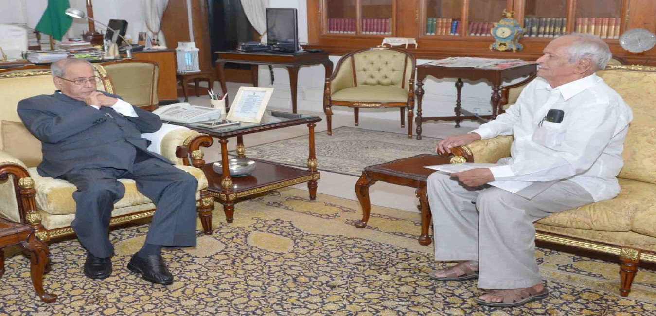 The President of India, Shri Pranab Mukherjee meeting with Shri S.R.S. Verenkar from Uttar Kannada district, Karnataka, at Rashtrapati Bhavan on February 09, 2017.