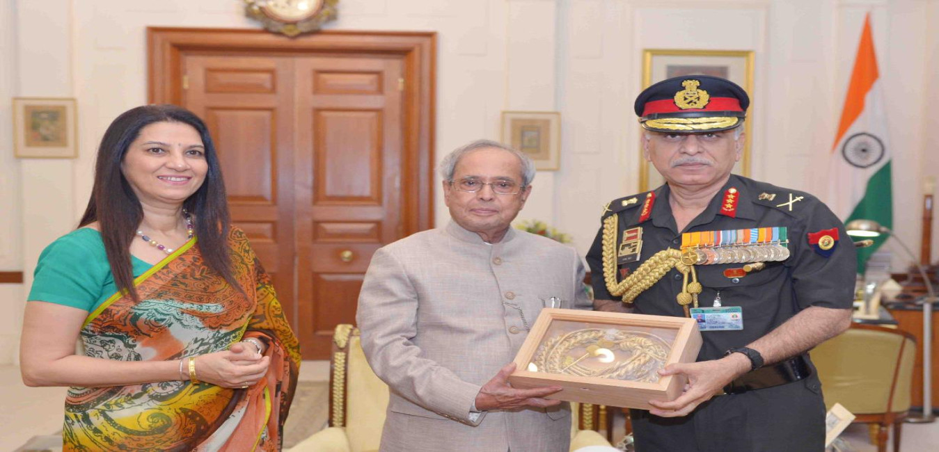 The President of India, Shri Pranab Mukherjee meeting with Lt. Gen. MMS Rai, Vice Chief of Army Staff & Hony ADC to the President alongwith his wife Smt. Kiran Rai, at Rashtrapati Bhavan on August 10, 2016.