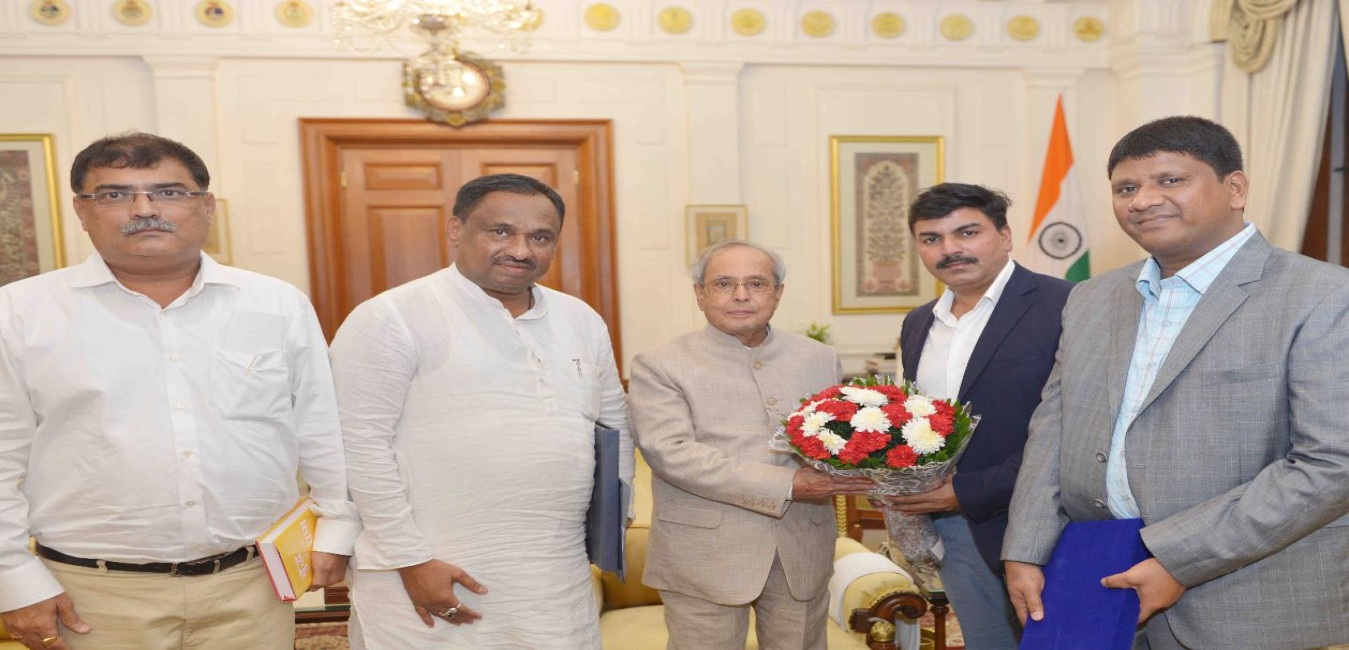 The President of India, Shri Pranab Mukherjee receiving a Coffee Table Book ''Yugparvartak Mahamanav Bharat Ratna Dr. Babasaheb Ambedkar'' from Shri Rahul Shewale, MP(LS) with others from Chaitayabhoomi Samanvaya Samiti, at Rashtrapati Bhavan on August 10, 2016.