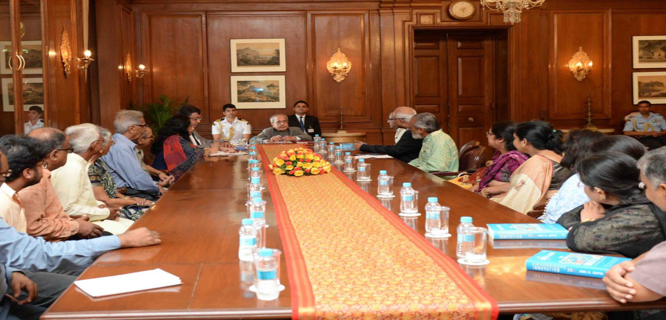 The President of India, Shri Pranab Mukherjee meeting with Shri Fakhrul Imam with others, at Rashtrapati Bhavan on August 04, 2016.