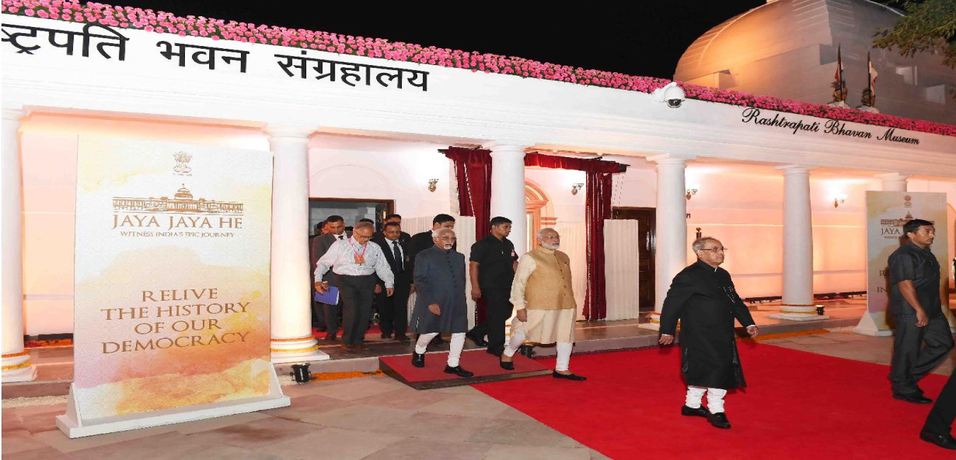 The President of India, Shri Pranab Mukherjee, the Vice President of India, Shri M. Hamid Ansari, the Prime Minister of India, Shri Narendra Modi and other dignitaries going around at Rashtrapati Bhavan Museum, in New Delhi on July 25, 2016.