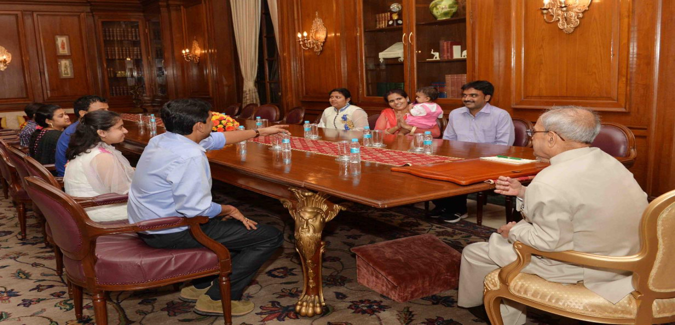 The President of India, Shri Pranab Mukherjee meeting with Shri Abhijit Mukherjee, MP (LS) & Chairman with others from IKRDC, Kirnahar, at Rashtrapati Bhavan on March 30, 2016.