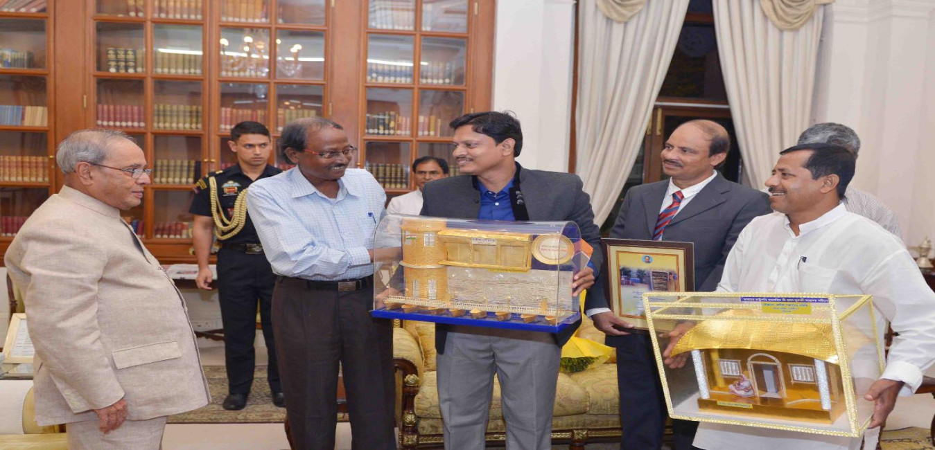 The President of India, Shri Pranab Mukherjee meeting with Shri Dulal Chandra Kar, Ex-Headmaster Ghatal Vidyasagar High School with others from Ghatal, Paschim Medinipur, at Rashtrapati Bhavan on September 24, 2016.