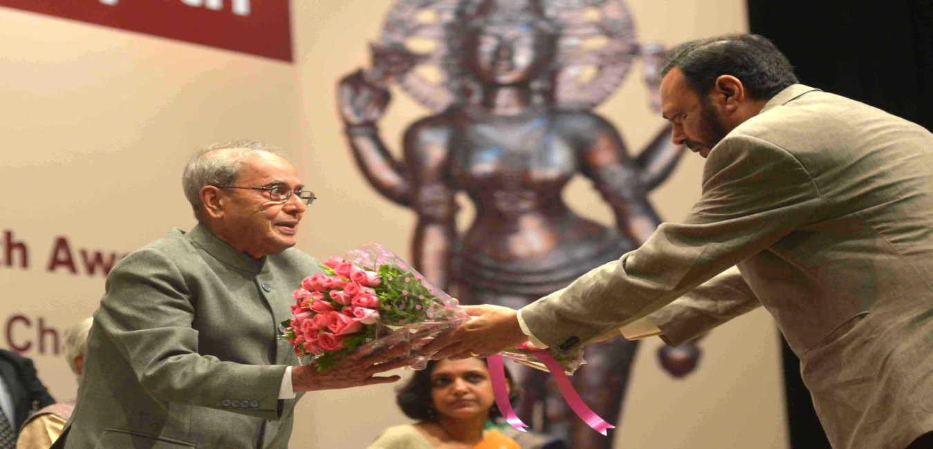 The President of India, Shri Pranab Mukherjee presenting the 51st Jnanpith Award to Dr. Raghuveer Chaudhary, at Balyogi Auditorium, Parliament Library Building, Parliament House, in New Delhi on July 11, 2016.