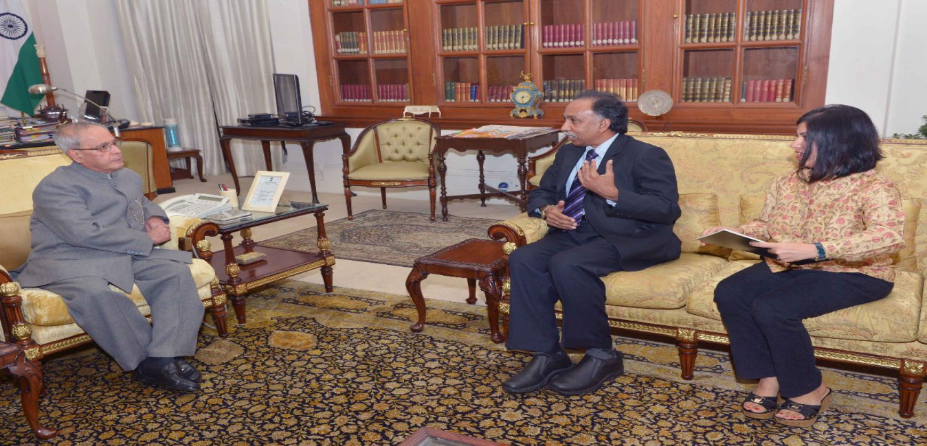 The President of India, Shri Pranab Mukherjee meeting with Shri S.D. Shibulal, President & Ms. Bhavna Mehra, General Manager, Infosys Science Foundation, Bangalore, at Rashtrapati Bhavan, in New Delhi on October 16, 2015.