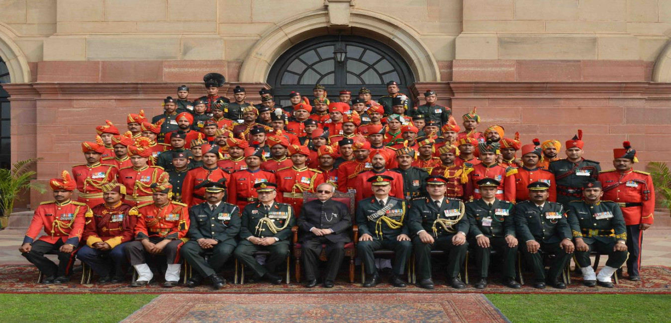 The President of India, Shri Pranab Mukherjee with the personnel of Tri Service Band Contingents (participants of the Beating Retreat Ceremony) and Provost Outriders of the Three Services, at Rashtrapati Bhavan on January 30, 2016.