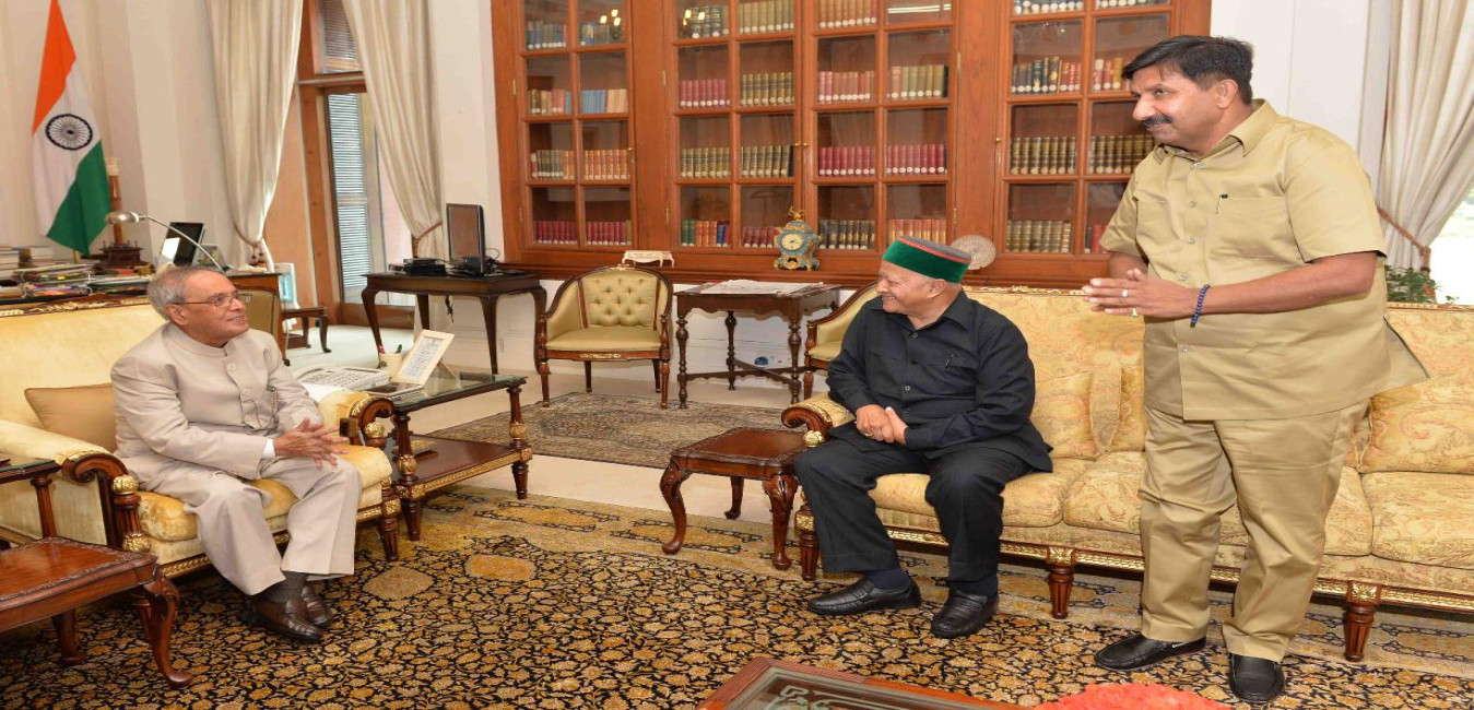 The President of India, Shri Pranab Mukherjee meeting with Shri Virbhadra Singh, Chief Minister, Himachal Pradesh and Shri Mukesh Agnihori, Industry Minister, Himachal Pradesh, at Rashtrapati Bhavan, in New Delhi on August 22, 2015.