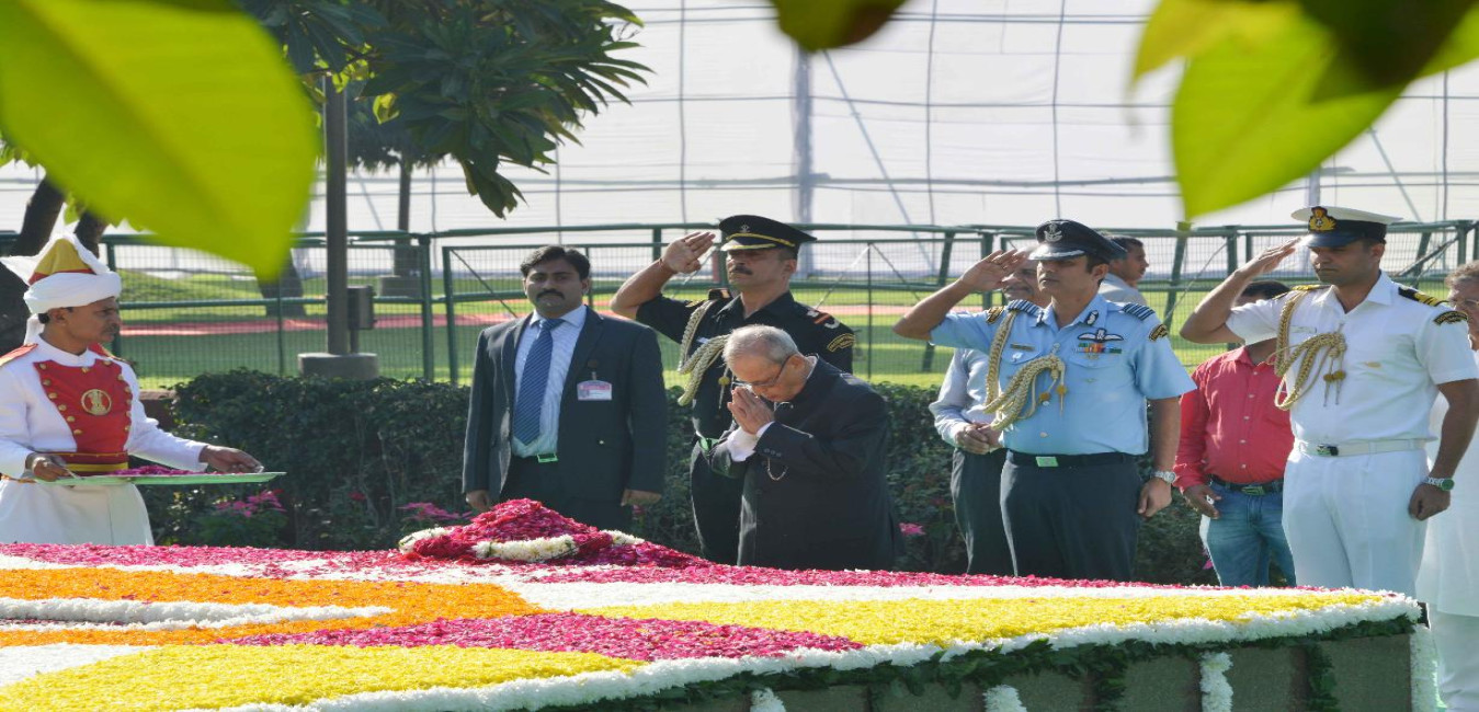 The President of India, Shri Pranab Mukherjee paying floral tributes at the Samadhi of Mahatma Gandhi on the occasion of his 146th Birth Anniversary, at Rajghat, in Delhi on October 02, 2015 .