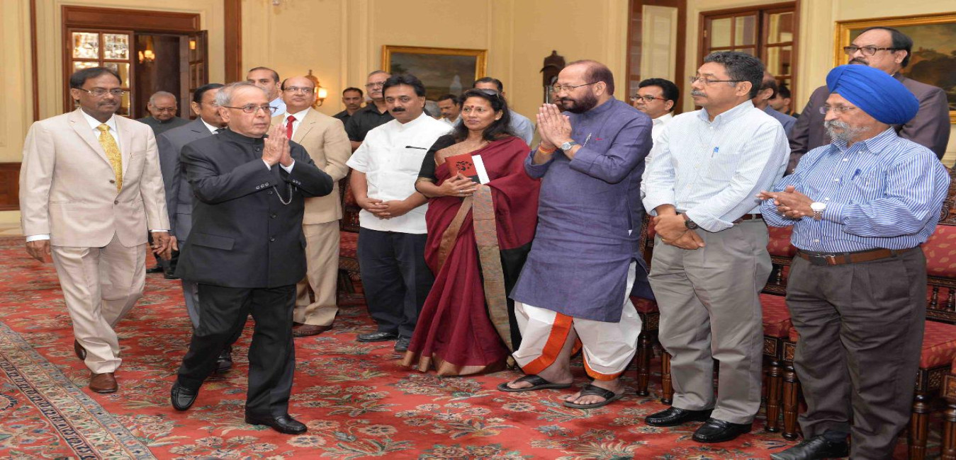 The President of India, Shri Pranab Mukherjee meeting with Shri G. Subba Rao, Director, Delhi International Airport Ltd. alongwith Shri Dixitulu, at Rashtrapati Bhavan, in New Delhi on October 01, 2015.