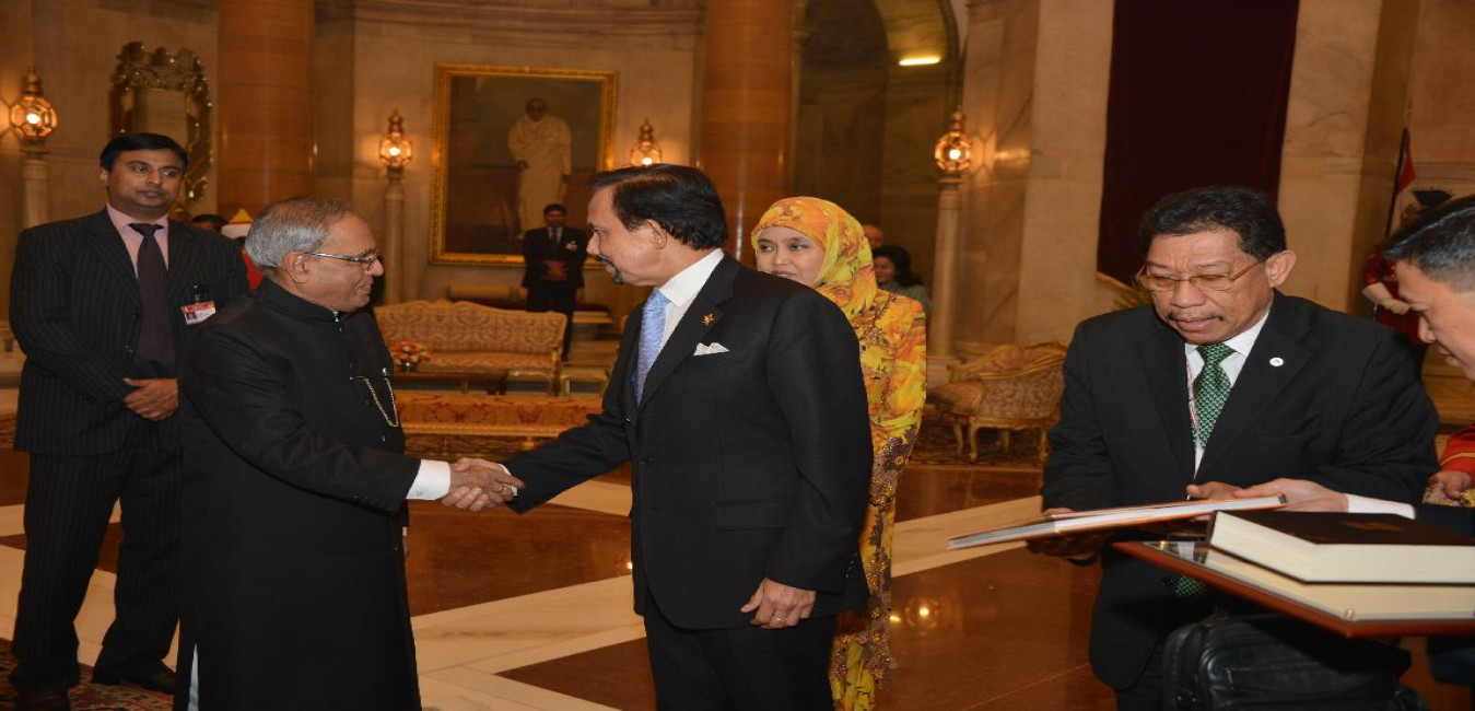 The President of India, Shri Pranab Mukherjee with The Sultan of Brunei Darussalam Delegation of ASEAN-India Special Commemorative Summit (Call on & Farewell) on Dec 20, 2012