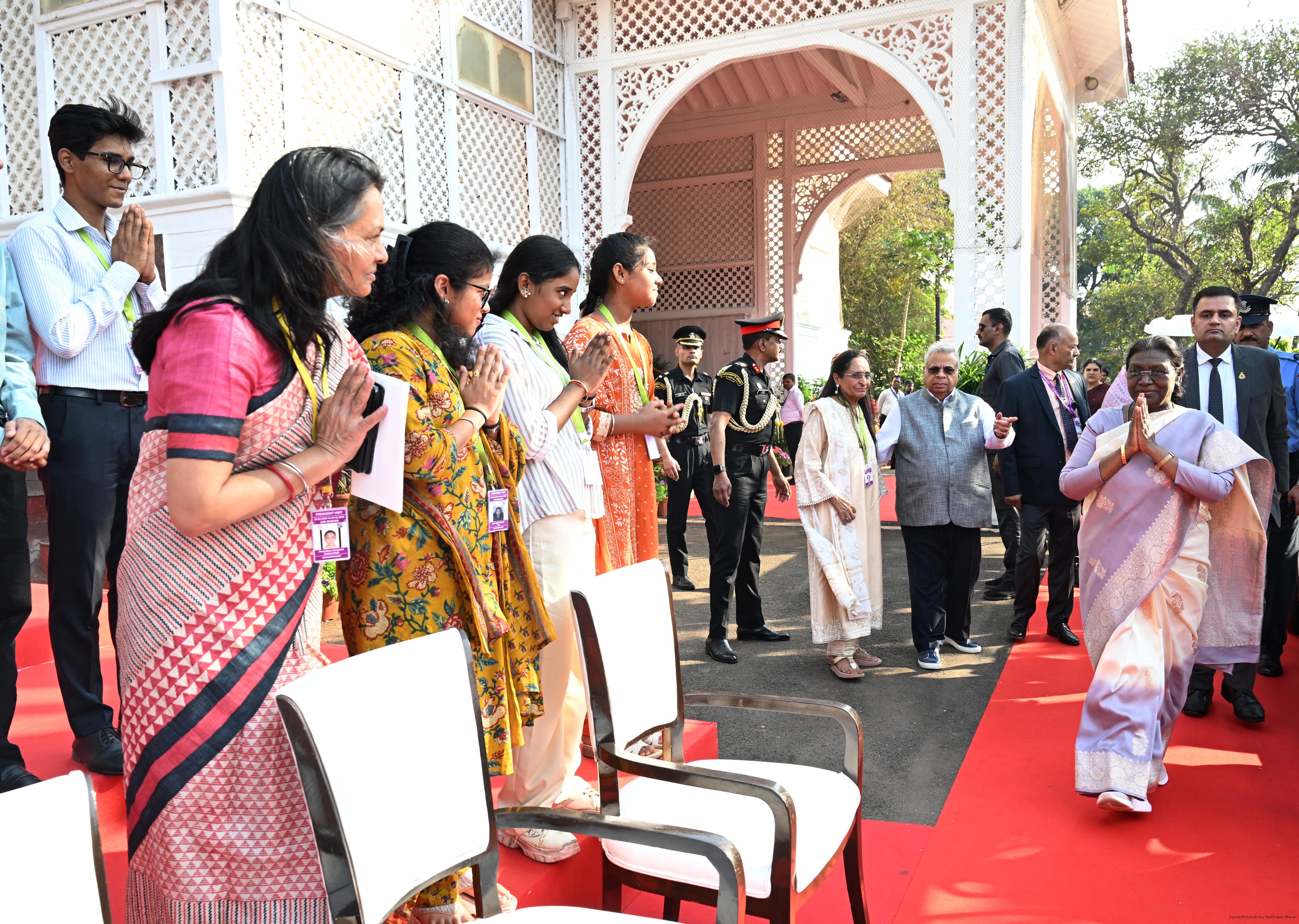 The Governor of Maharashtra, Shri Acharya Devvrat, Chief Minister Shri Devendra Fadnavis and Deputy Chief Ministers Shri Eknath Shinde and Smt Sunetra Ajit Pawar received the President of India, Smt Droupadi Murmu on her arrival at Mumbai on February 24, 2026.