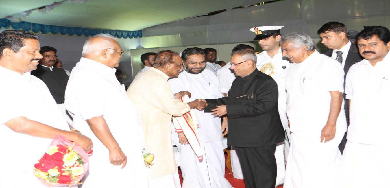 The President of India, Shri Pranab Mukherjee With Prof KV Thomas, Minister of State (I/C) For Consumer Affairs, Food & Public Distribution Shri Tonny Chammany , Mayor Shri R Thyagarajan, Standing Committee Chairman and 31 councilors from The Corporation of Cochin (Total 34 Persons) on October 19, 2012