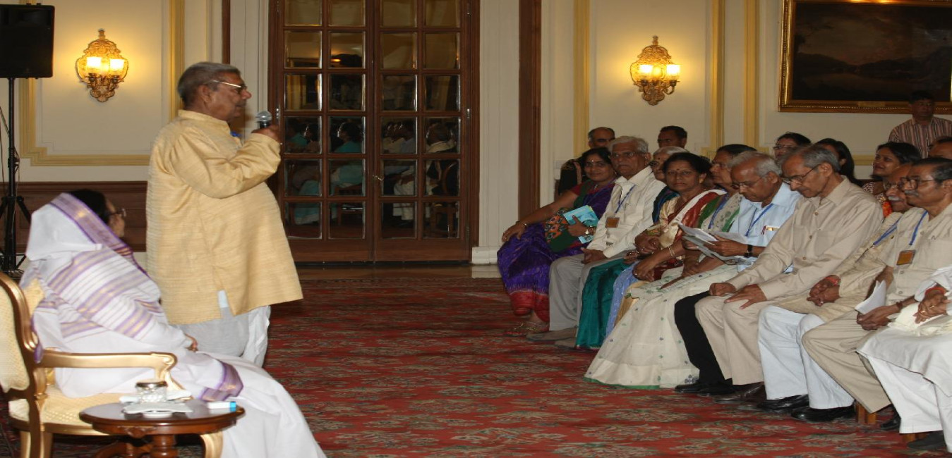 The President of India, Smt Pratibha Devisingh Patil interacting with Shri Purushottam Alias Annasaheb Patil and others at Rashtrapati Bhavan in New Delhi on April 16, 2009