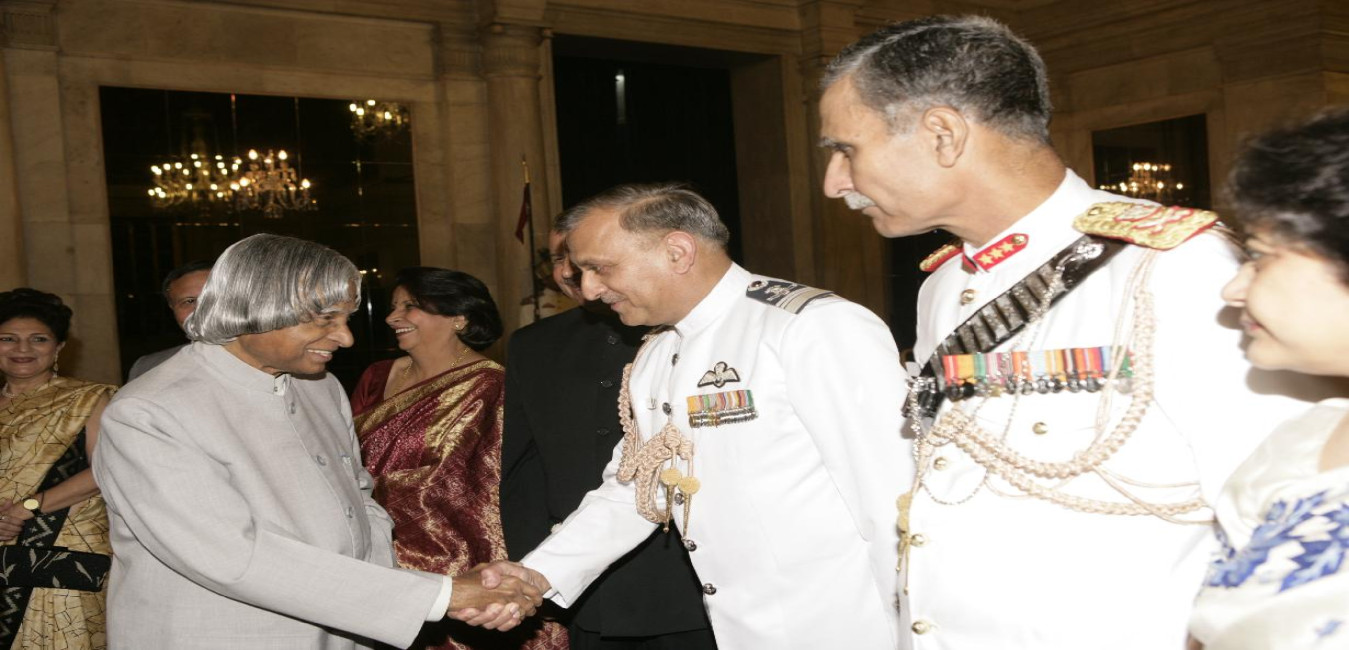 The President of India, Dr A P J Abdul Kalam at the Farewell Call by Admiral Arun Prakash, PVSM, AVSM, VrC, VSM, ADC Chief of the Naval Staff with his wife at Rashtrapati Bhavan in New Delhi on Oct 27, 2006