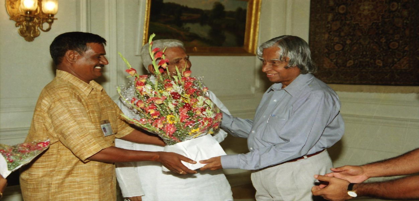 The President of India, Dr A P J Abdul Kalam meeting with the Farmers Associated with ''Swarnamukhi Rejuvenation Project'' from Andhra Pradesh led by Dr G Munirathnam, Hony General Secretary, Rashtriya Seva Samithi at the Yellow Drawing Room of Rashtrapati Bhavan in New Delhi on Aug 24, 2002