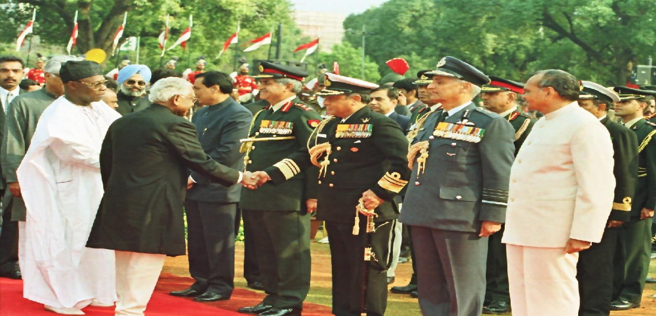 The President of India, Shri K R Narayanan at the Ceremonial Reception of the President of the Federal Republic of Nigeria, HE Mr Olusengun Obasanjo at the Forecourt of Rashtrapati Bhavan in New Delhi on Jan 25, 2000