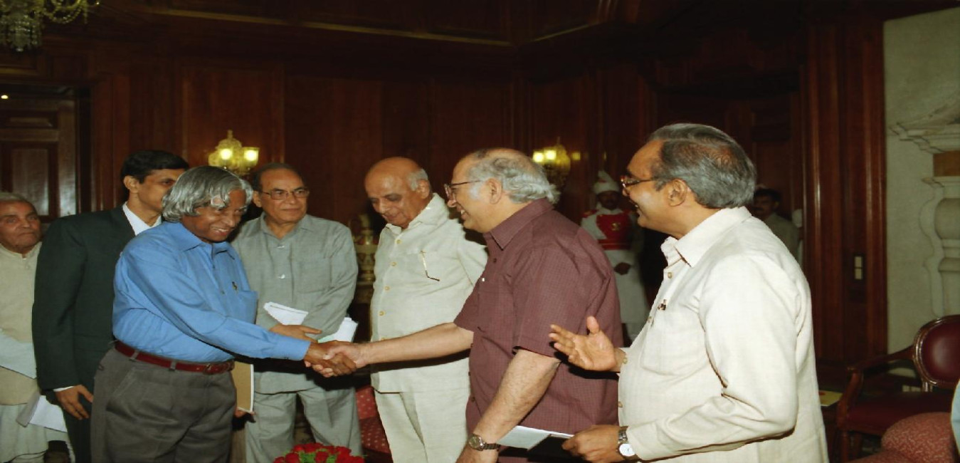 The Prof P Rama Rao, President & other Office- bearers of the Indian National Academy of Engineering calling on the President of India, Dr A P J Abdul Kalam on the Presentation of ''Computer Aided Literacy Programme'' by Prof P N Murthy, Fellow of Academy at the Committee Room of Rashtrapati Bhavan in New Delhi on Aug 15, 2002