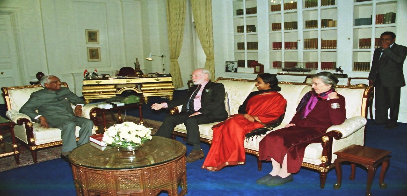 The President of India, Shri K R Narayanan receiving a copy of the Book Working a Democratic Constitution The Indian Experience from Mr Granville Austin at Rashtrapati Bhavan in New Delhi on Feb 01, 2000
