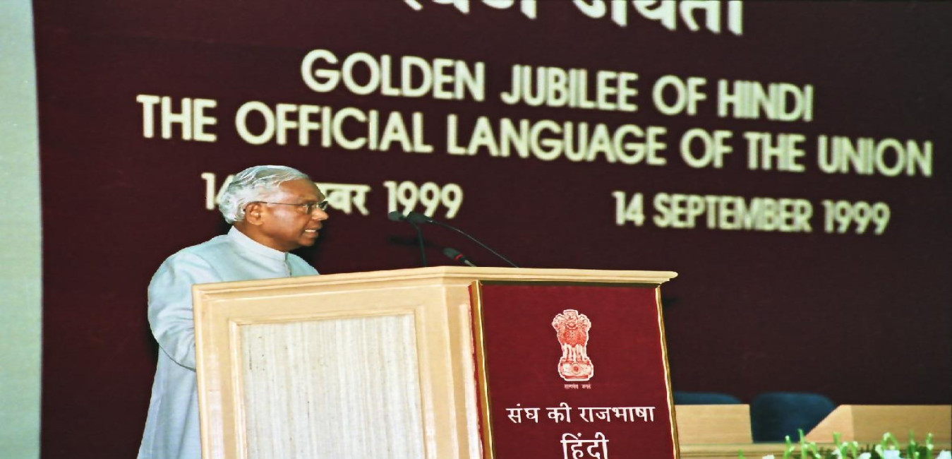 The President of India, Shri K R Narayanan inaugurating the Golden Jubilee Celebration of Hindi the Official Language of the Union at Vigyan Bhavan in New Delhi on Sep 14, 1999
