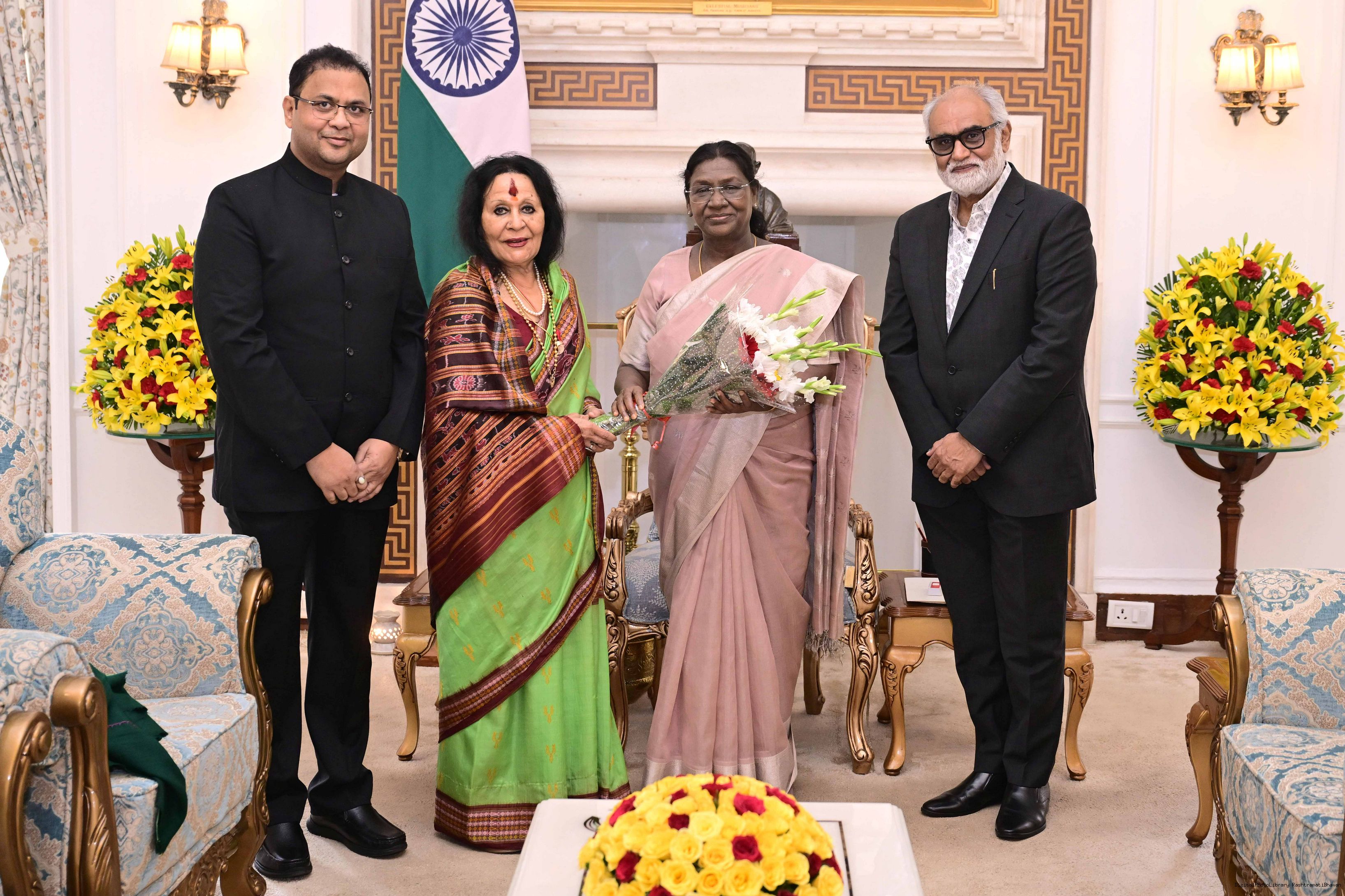 Dr. Sonal Mansingh, Padma Vibhushan Awardee and Chairperson along with Dr. Sachchidanand Joshi and Shri Ganga Kumar meeting with the President of India, Smt. Droupadi Murmu at Rashtrapati Bhavan on November 17, 2025.