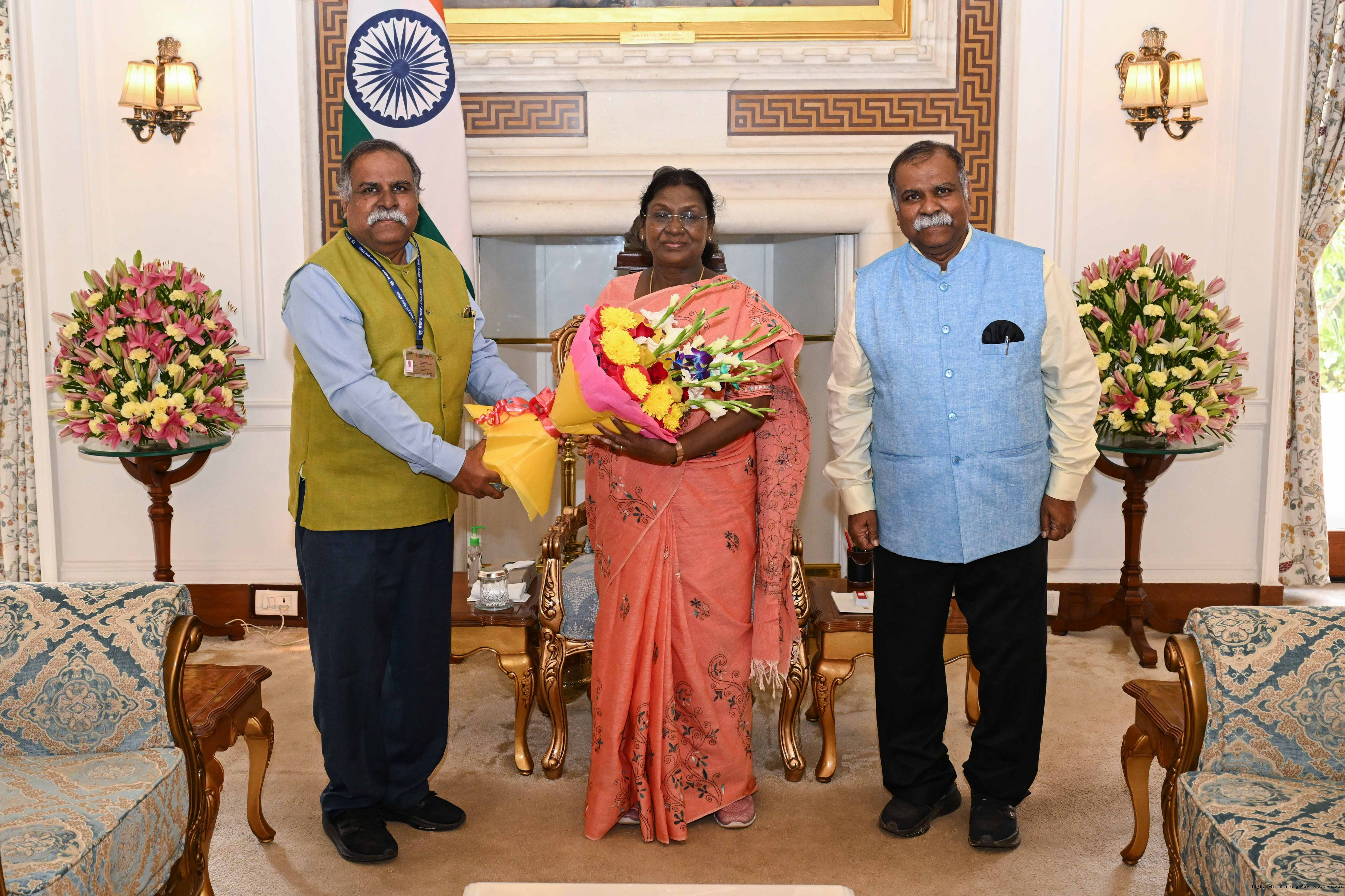 Prof. Kishor K. Basa, Chairman, National Monuments Authority, Ministry of Culture, Govt of India along with brother Shri Ashok Basa meeting with the President of India, Smt. Droupadi Murmu at Rashtrapati Bhavan on November 18, 2025.
