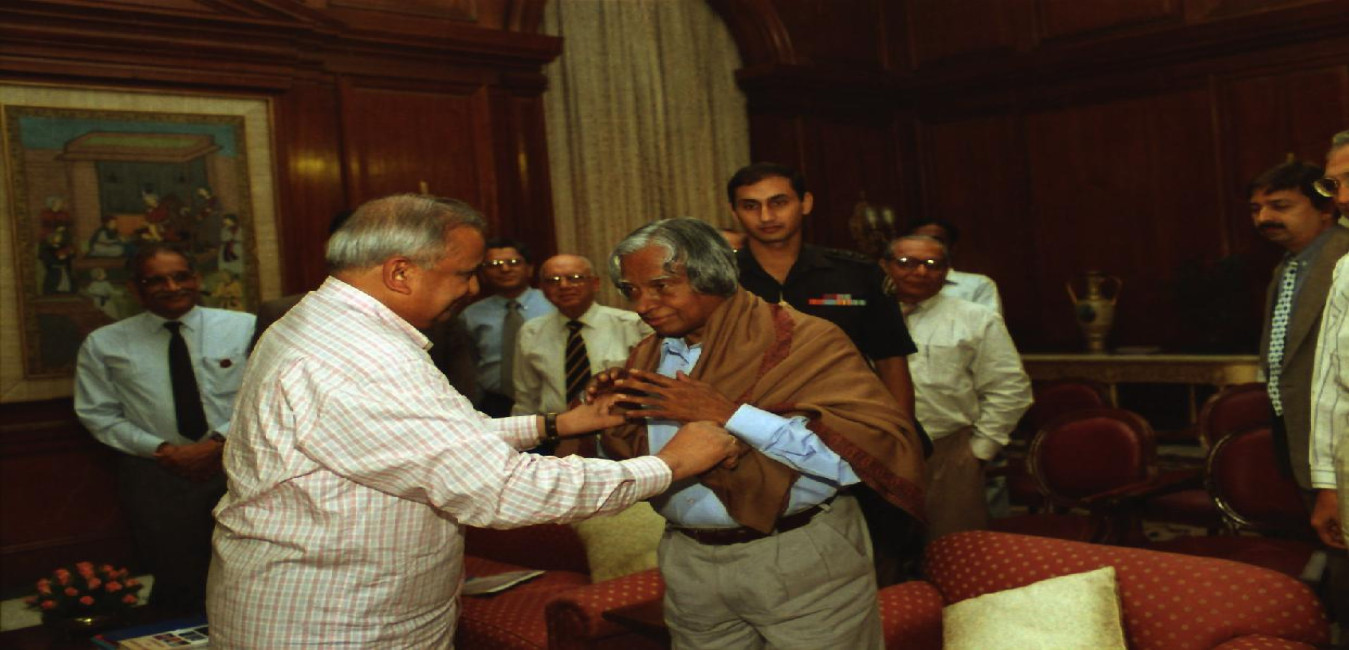 The Prof P Rama Rao, President & other Office- bearers of the Indian National Academy of Engineering calling on the President of India, Dr A P J Abdul Kalam on the Presentation of ''Computer Aided Literacy Programme'' by Prof P N Murthy, Fellow of Academy at the Committee Room of Rashtrapati Bhavan in New Delhi on Aug 15, 2002