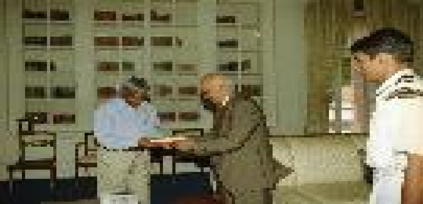 The President of India, Dr A P J Abdul Kalam interacting with the President of the Republic of Kyrgyzstan, His Excellency Mr Askar Akaev at the Morning Room of Rashtrapati Bhavan in New Delhi on Aug 07, 2002
