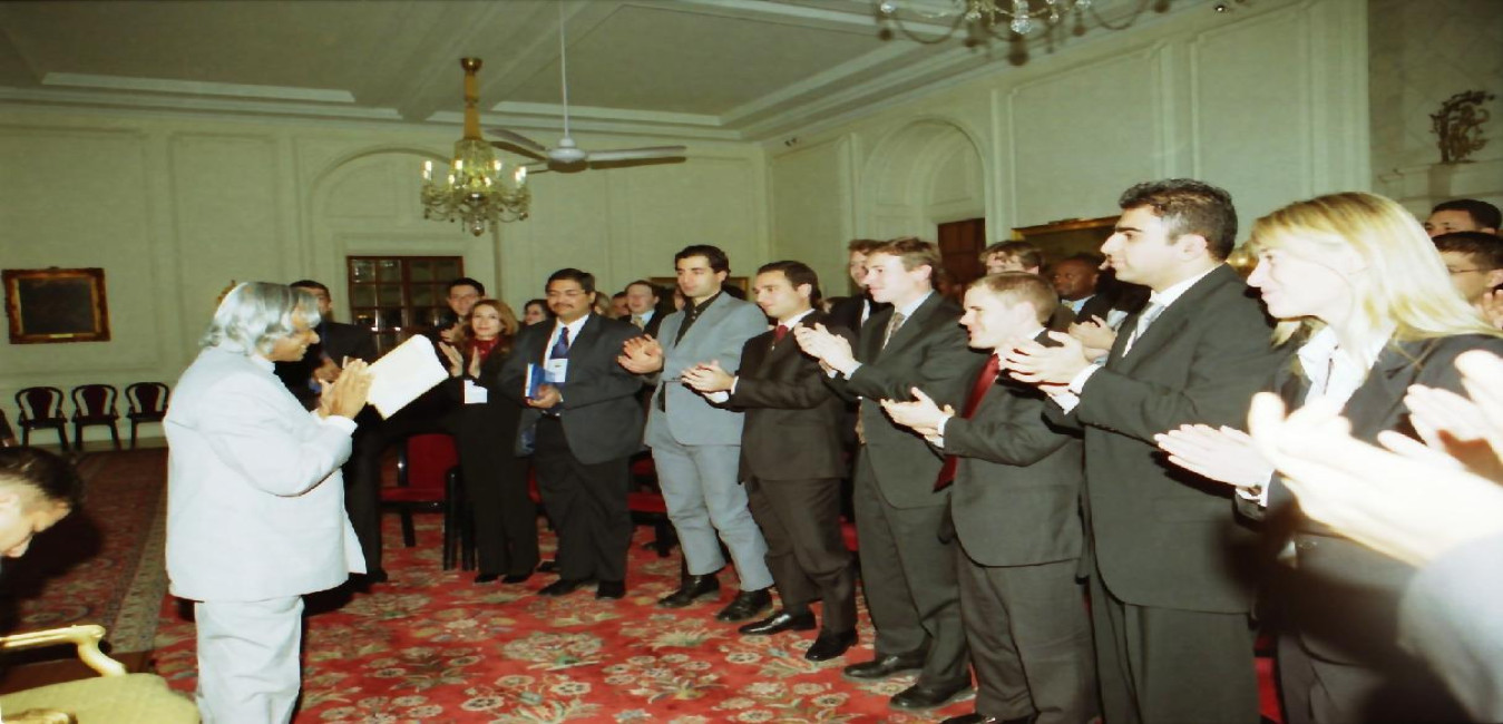 The Students from Harvard Business School Boston USA calling on the President of India, Dr A P J Abdul Kalam at the Yellow Drawing Room of Rashtrapati Bhavan in New Delhi on Dec 29, 2003