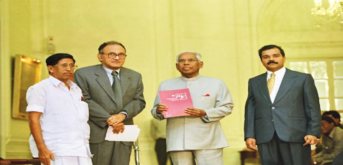 The President of India, Shri K R Narayanan receiving the First Copies of the 'The Austral Asian Journal of Cancer from Dr Thomas Koilparampil and 'The RCC Research One and a Half Decades from Dr Radhakrishna Pillai at the Yellow Drawing Room of Rashtrapati Bhavan in New Delhi on June 07, 2000