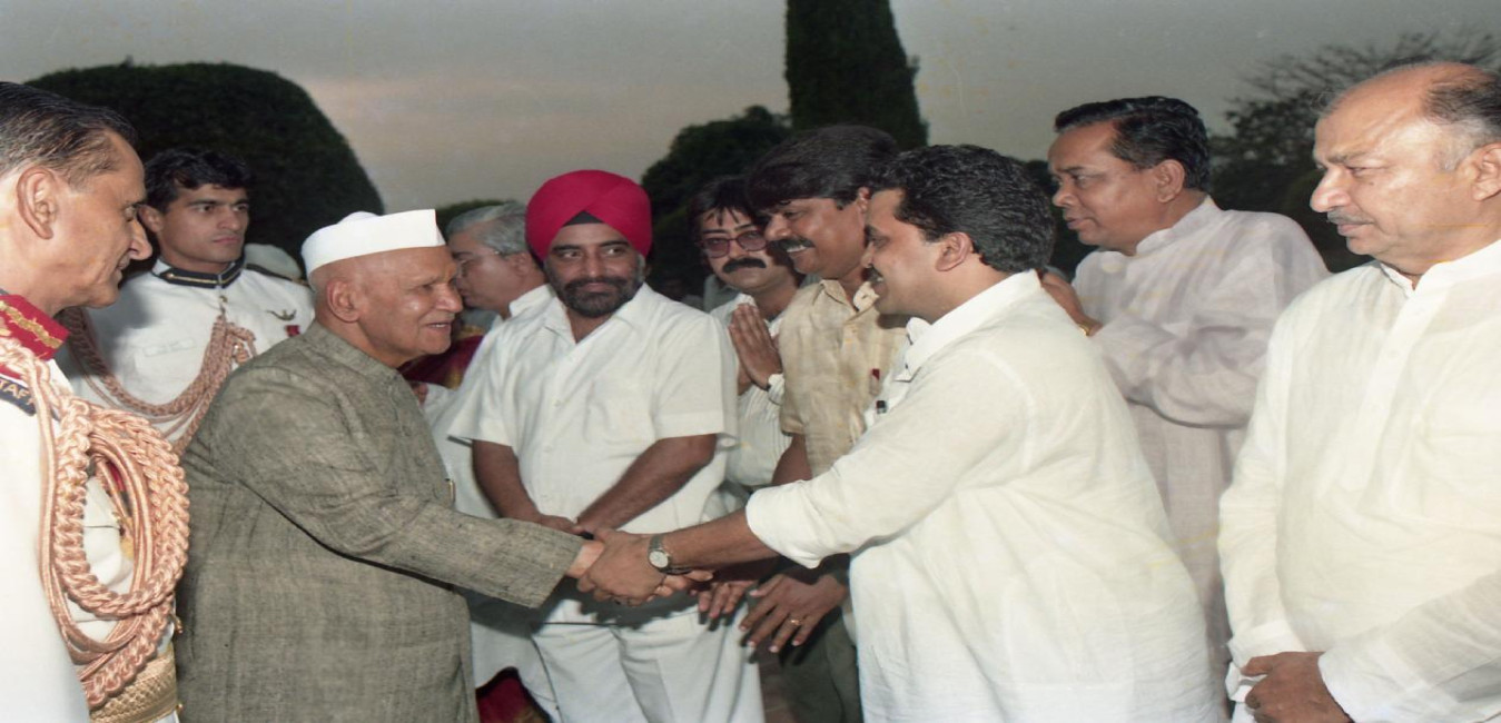 The President of India, Dr. Shankar Dayal Sharma meeting with Shri S.S. Sahay with others at Rashtrapati Bhavan in New Delhi on July 24, 1997