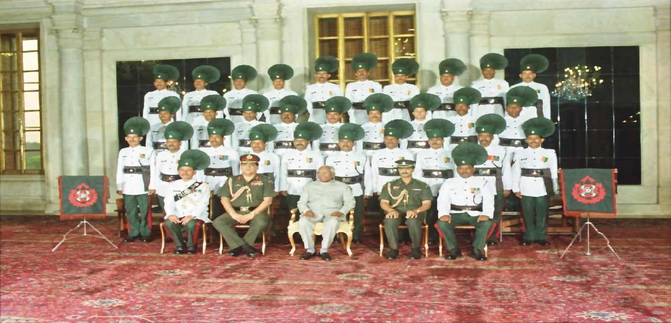 The President of India, Shri K R Narayanan posing for Group Photograph with Band Personnel of Raj Rif Regt Centre Brass Band at the Ashok Hall of Rashtrapati Bhavan in New Delhi on Sep 27, 1999