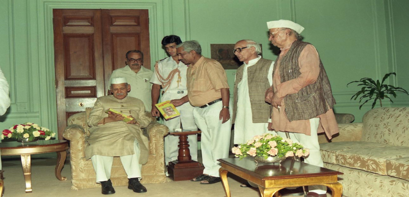 The President of India, Dr. Shankar Dayal Sharma meeting with Shri Madhu Deshmukh at Rashtrapati Bhavan in New Delhi on June 14, 1997.