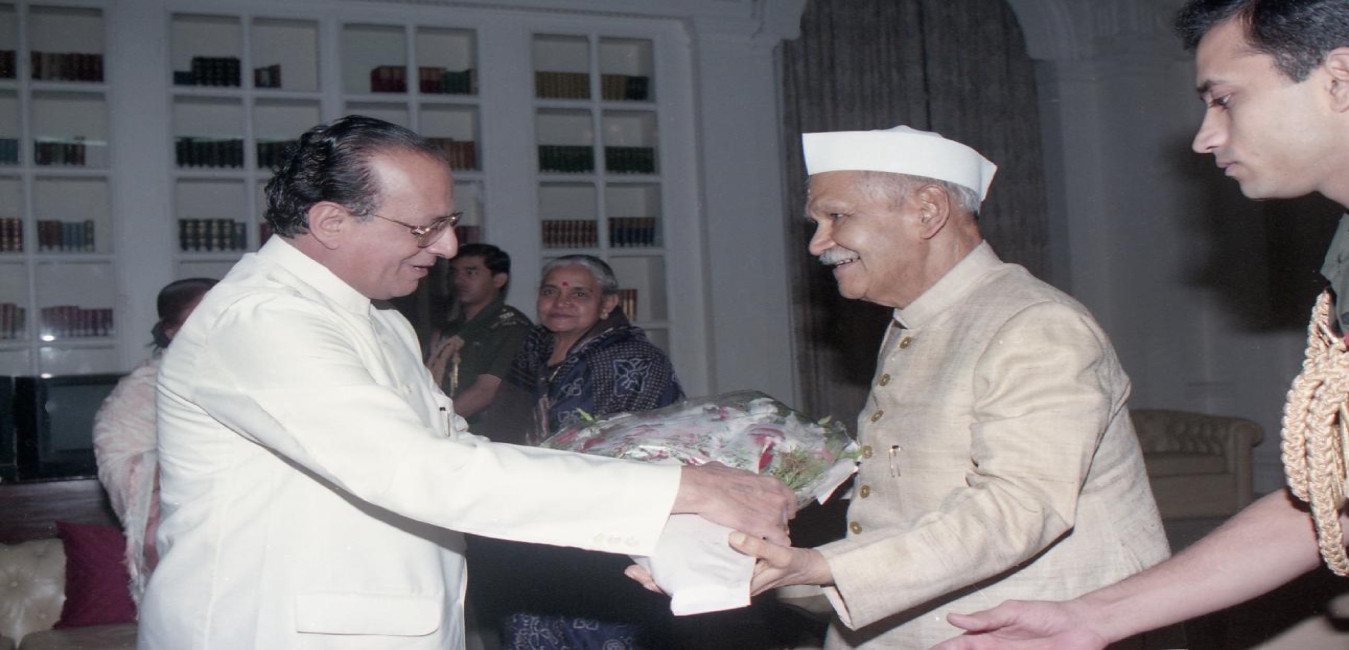 The President of India, Dr. Shankar Dayal Sharma meeting with Shri Sitaram Gupta with others at Rashtrapati Bhavan in New Delhi on May 16, 1997